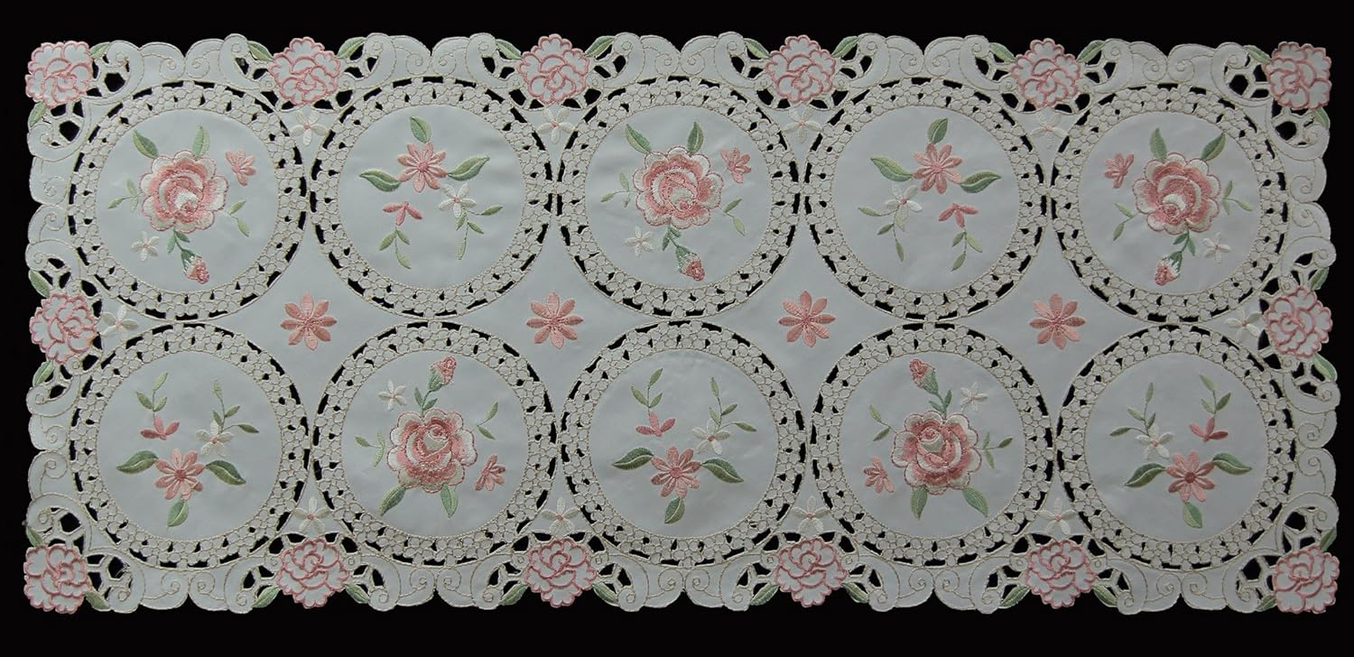 Creative Linens Embroidered Pink Rose Daisy Floral Table Runner Dresser Scarf 15x33 Ivory Spring