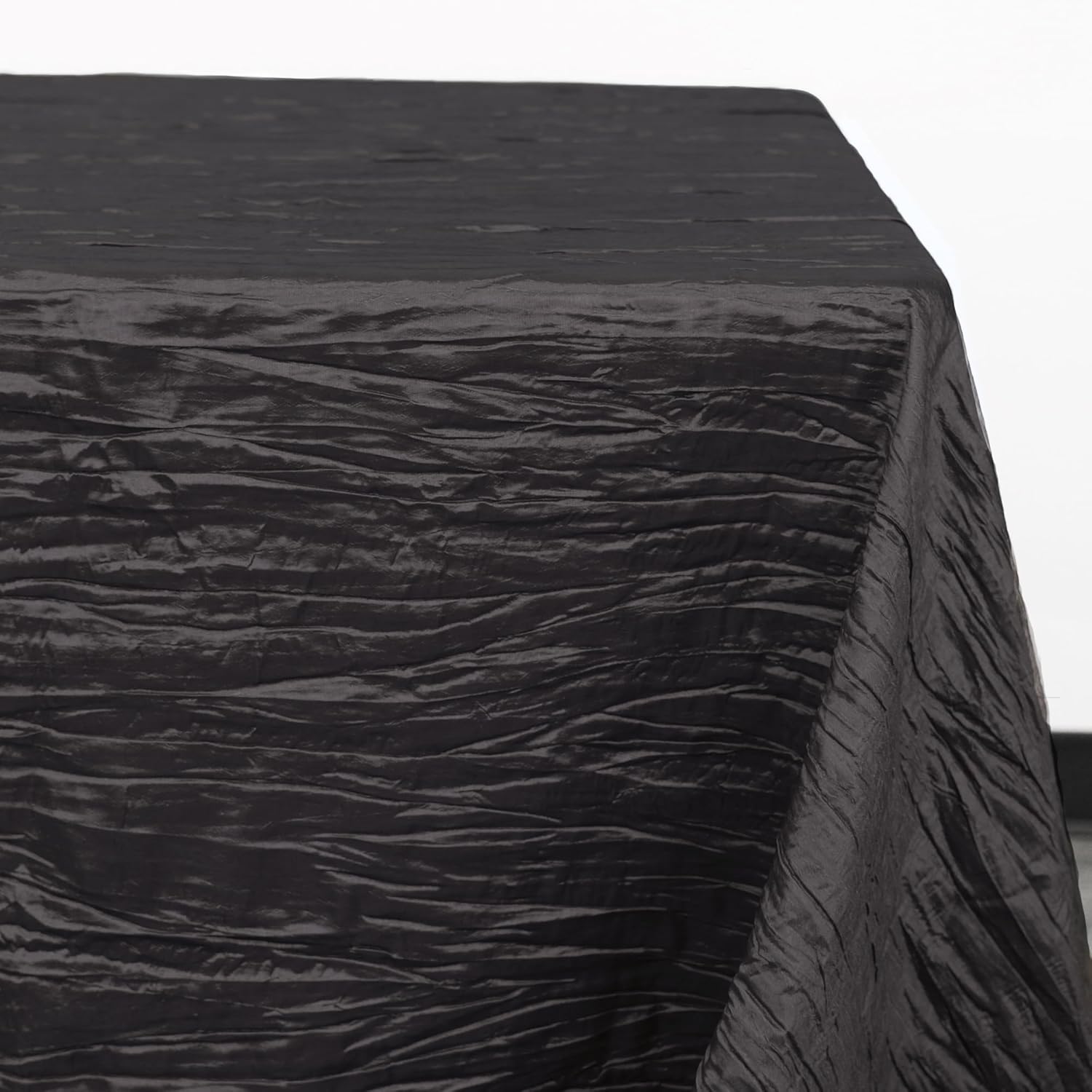- Transform your event with our 90 x 132 inch black crinkle taffeta tablecloth, designed for 6 ft rectangular tables, perfect for weddings and formal occasions.