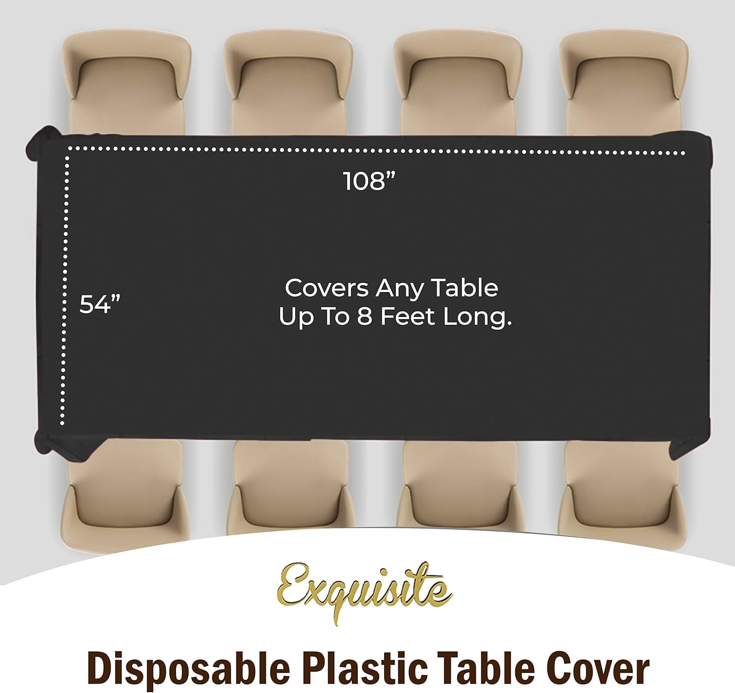 - PREMIUM QUALITY PROTECTION: This 12 pack of 54 in. x 108 in. Rectangle Black plastic tablecloths will cover any table up to 8 feet. Unlike your typical paper table clothes these disposable table covers for parties are spill and waterproof!!!