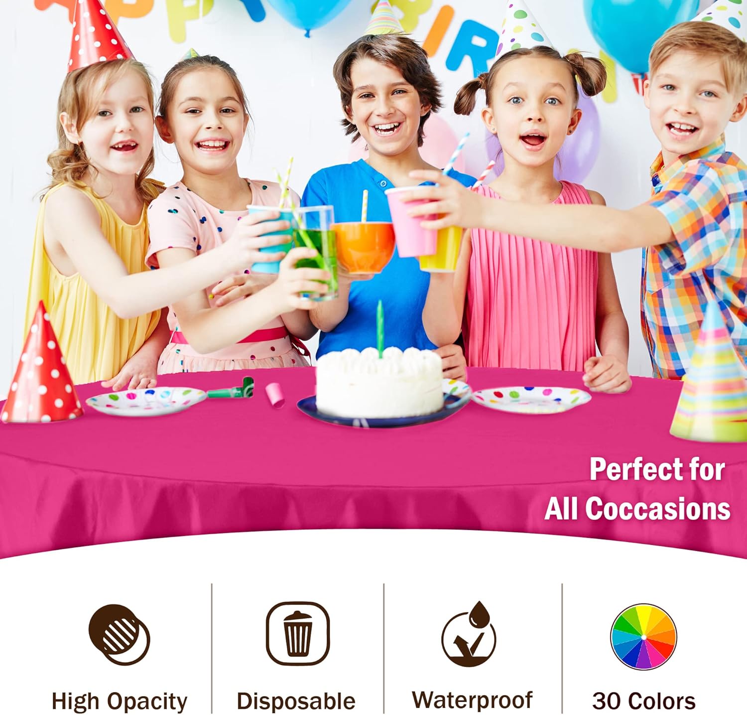 - PREMIUM QUALITY PROTECTION: This 12 pack of 84 in. Cerise Round plastic tablecloths will cover any table up to 7 feet. Unlike your typical paper table clothes these disposable table covers for parties are spill and waterproof!!!