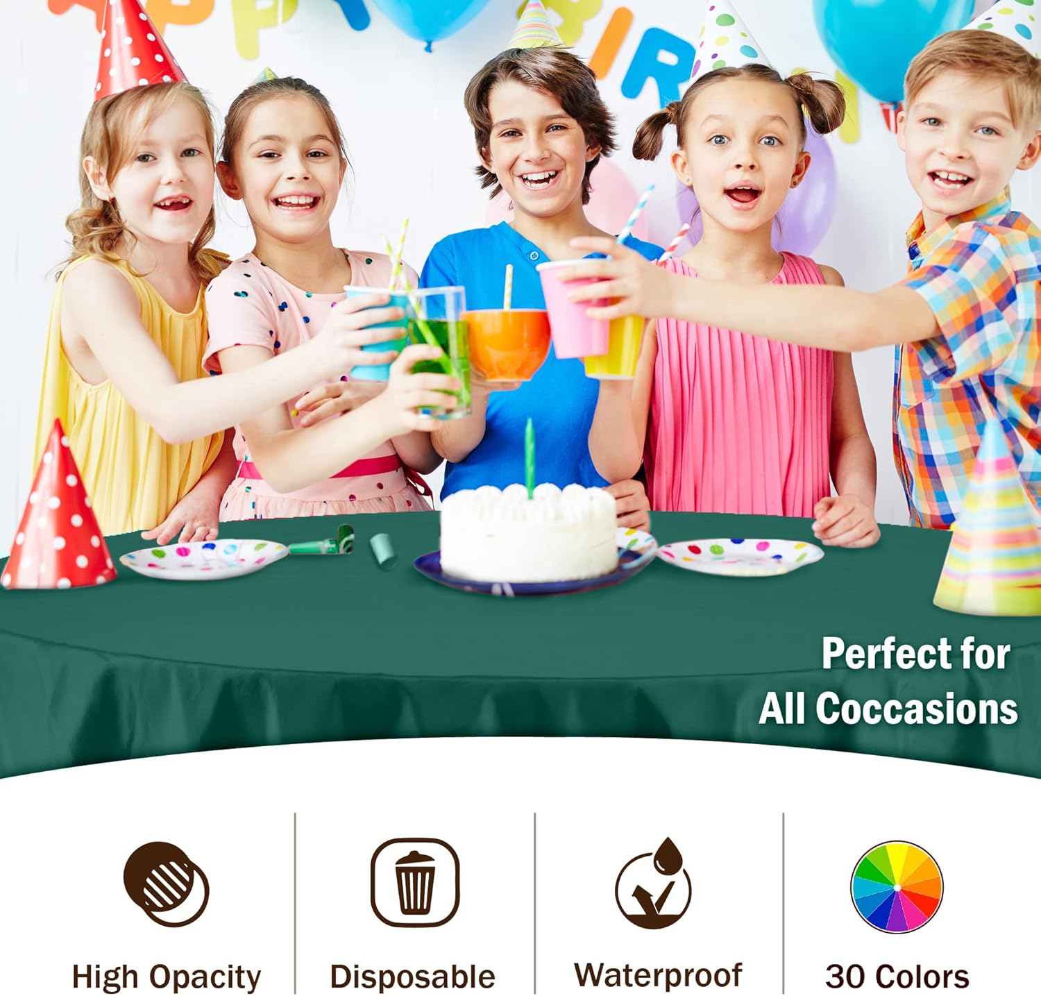 - PREMIUM QUALITY PROTECTION: This 12 pack of 84 in. Dark Green Round plastic tablecloths will cover any table up to 7 feet. Unlike your typical paper table clothes these disposable table covers for parties are spill and waterproof!!!