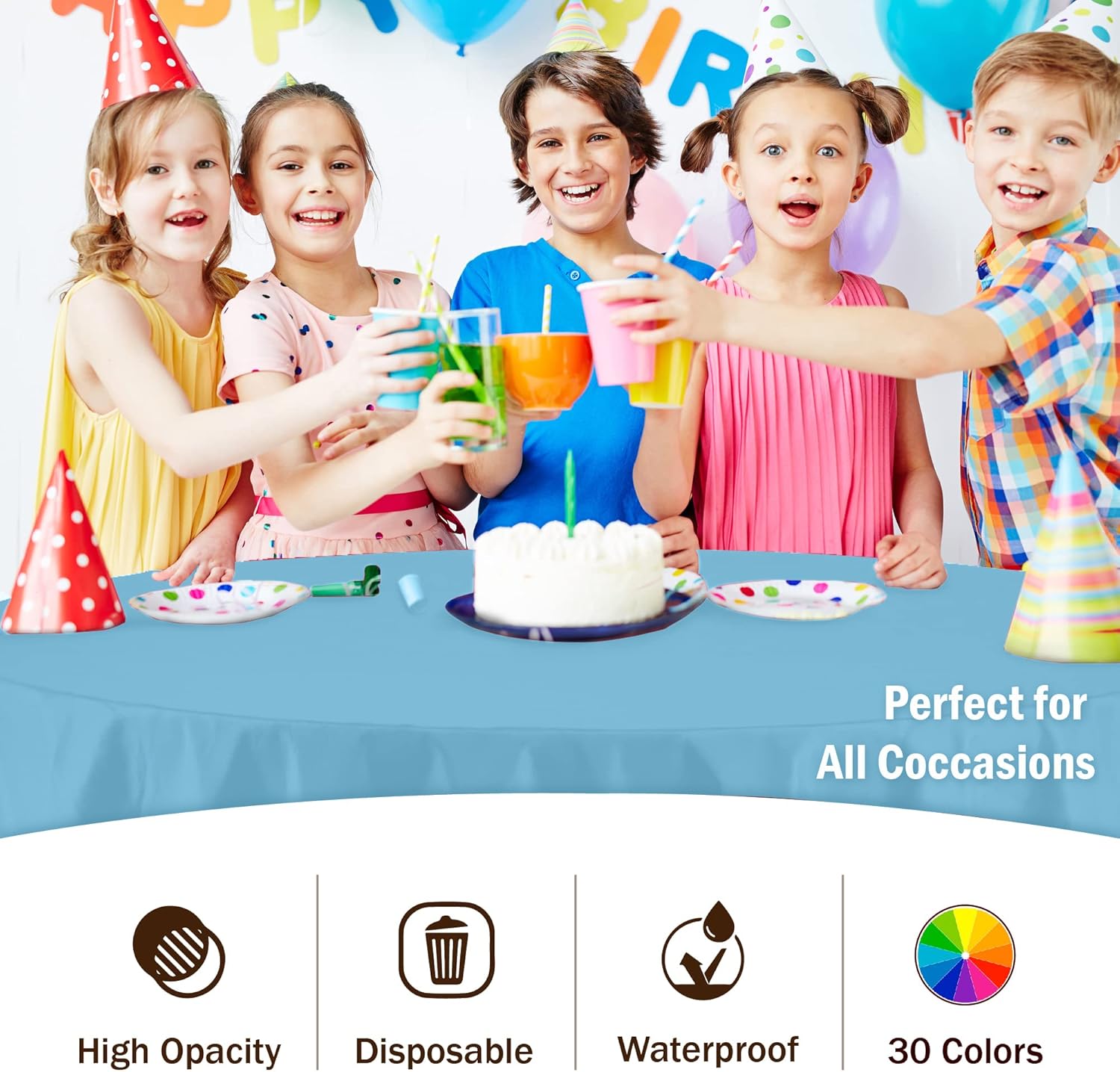 - PREMIUM QUALITY PROTECTION: This 12 pack of 84 in. Sky Blue Round plastic tablecloths will cover any table up to 7 feet. Unlike your typical paper table clothes these disposable table covers for parties are spill and waterproof!!!