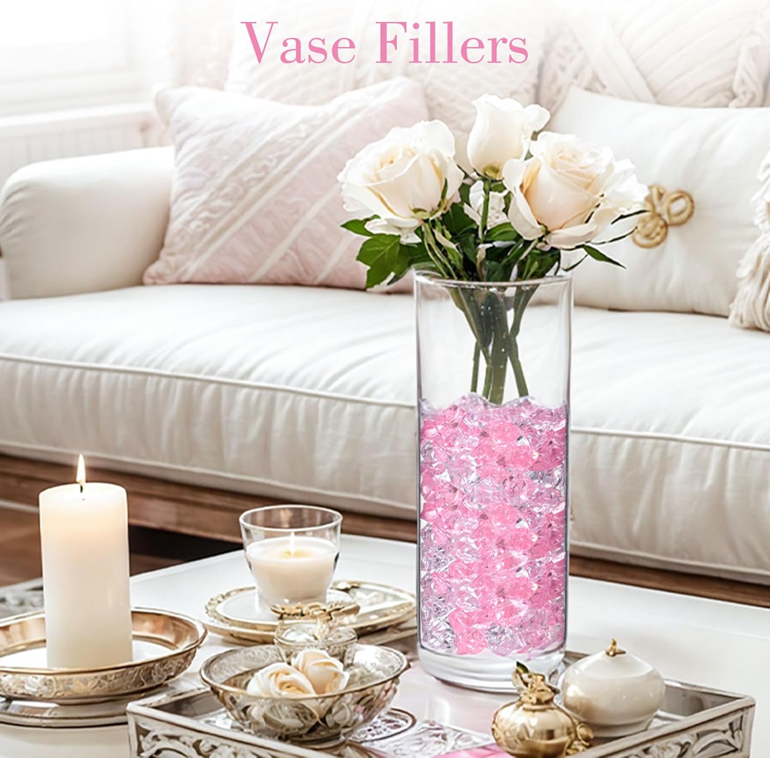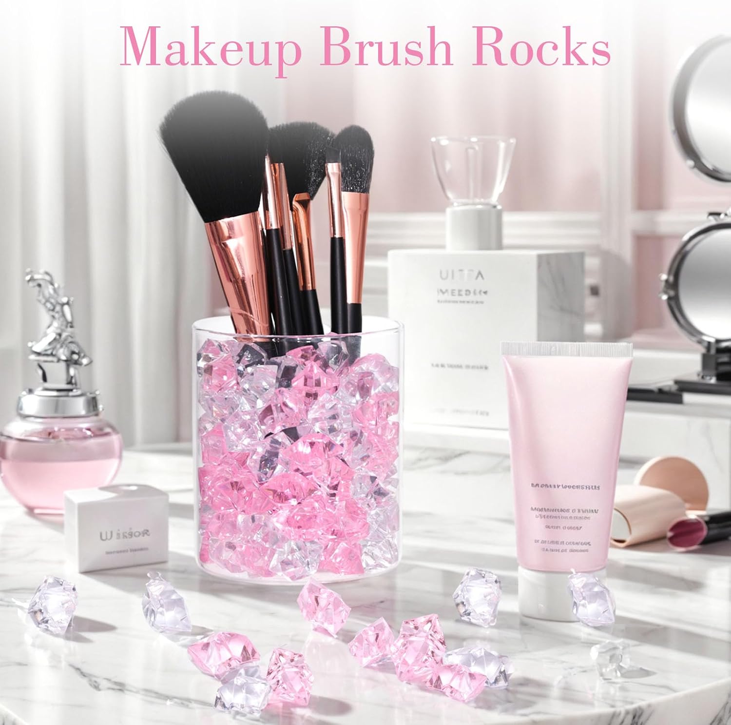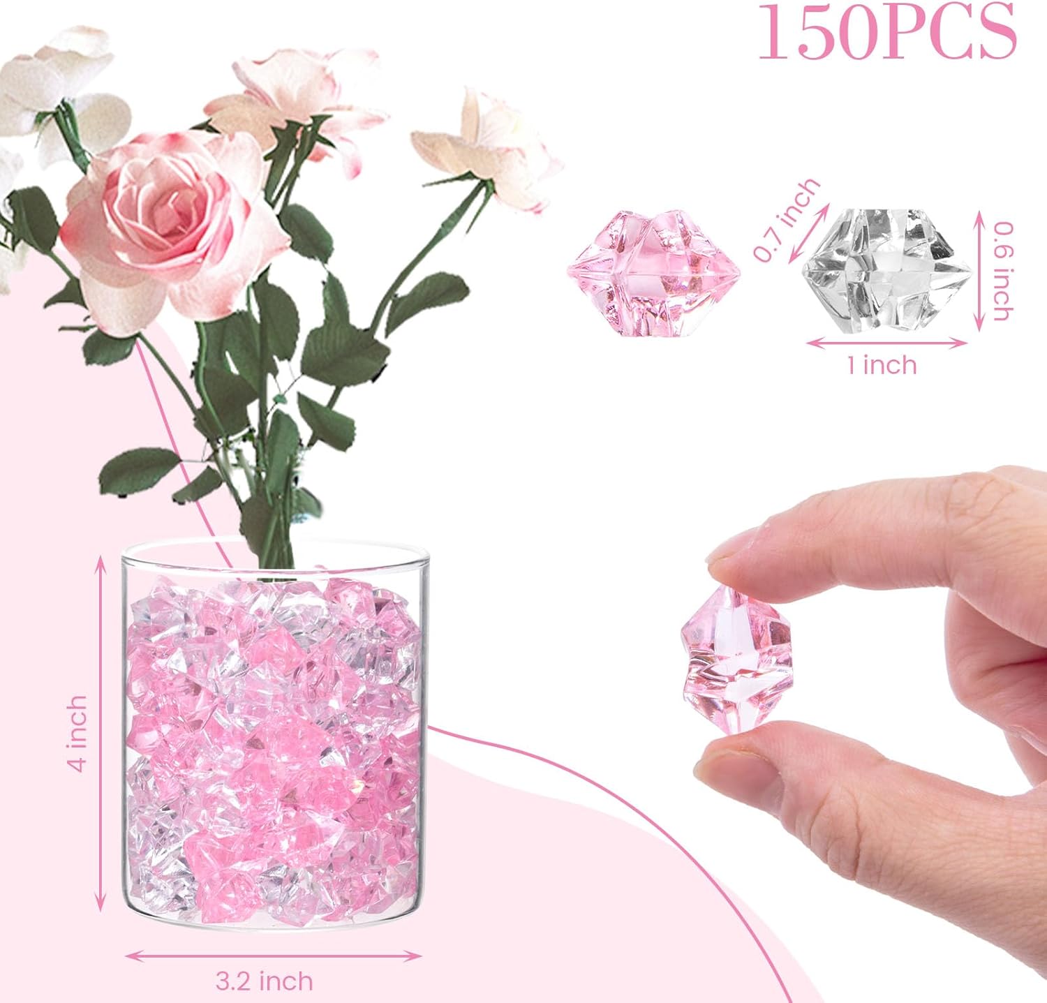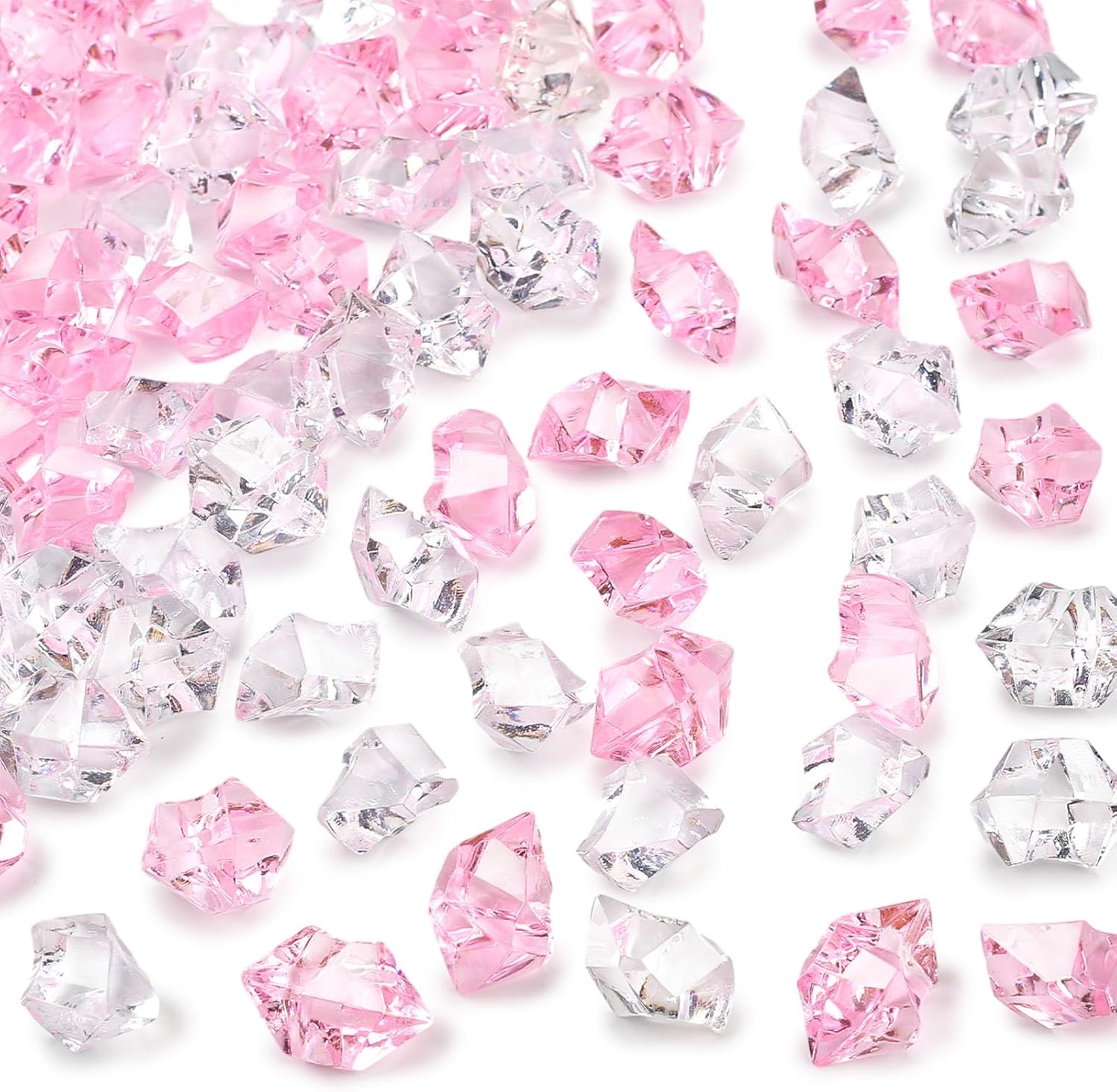 DomeStar Fake Ice, 150PCS Acrylic Fake Diamonds Vase Fillers Pink and Transparent Rocks Plastic Gems for Party Table Scatter Decor