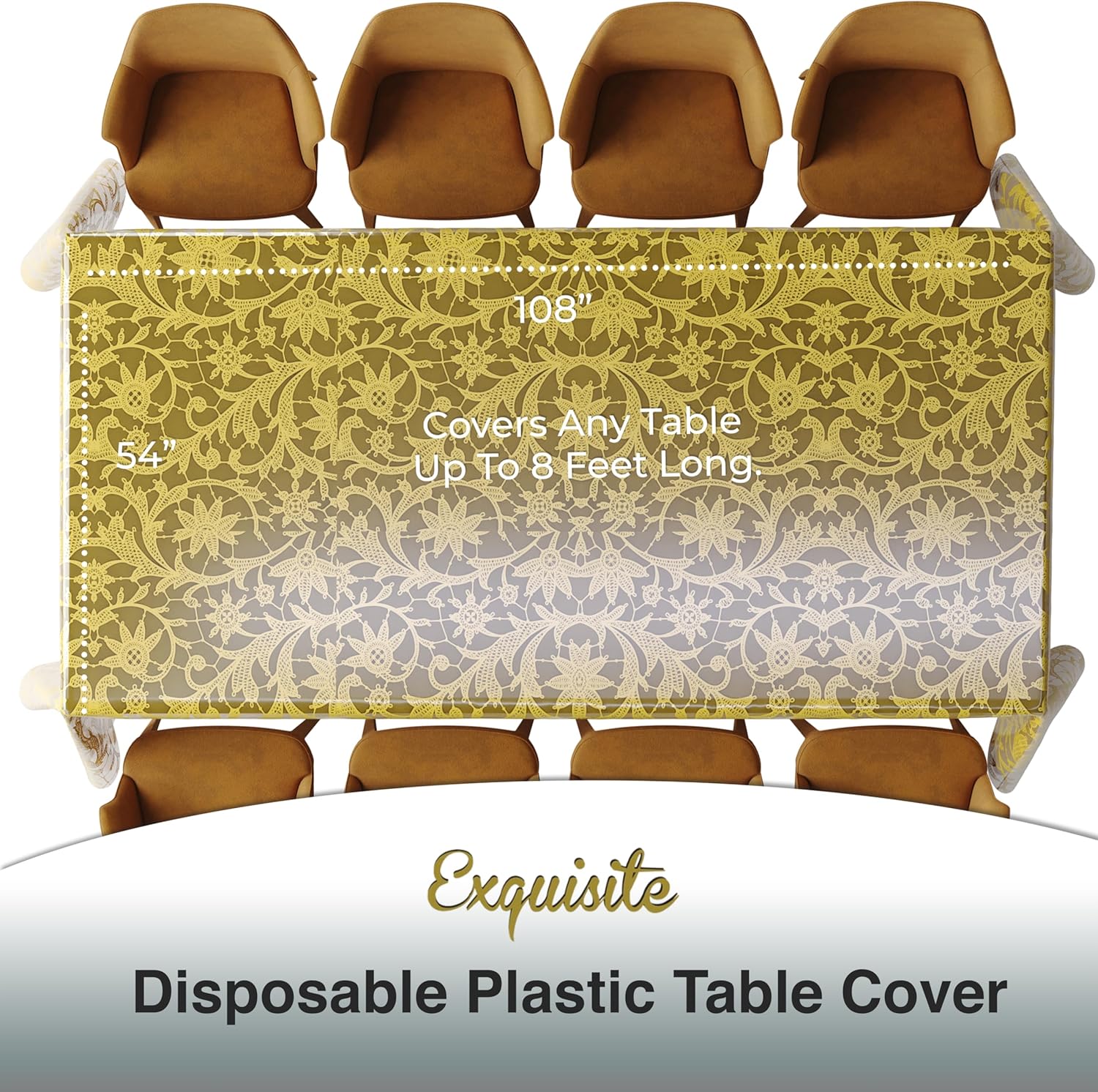 - Includes: This 12-pack of transparent gold lace table cloth rectangle table coverings offers elegant protection for your furniture. Each gold table cloth rectangle measures 54" X 108", making it ideal for standard tables. These clear plastic table cloth disposable covers combine functionality with beauty. Being disposable tablecloth yet fancy flower tablecloth at the same time.