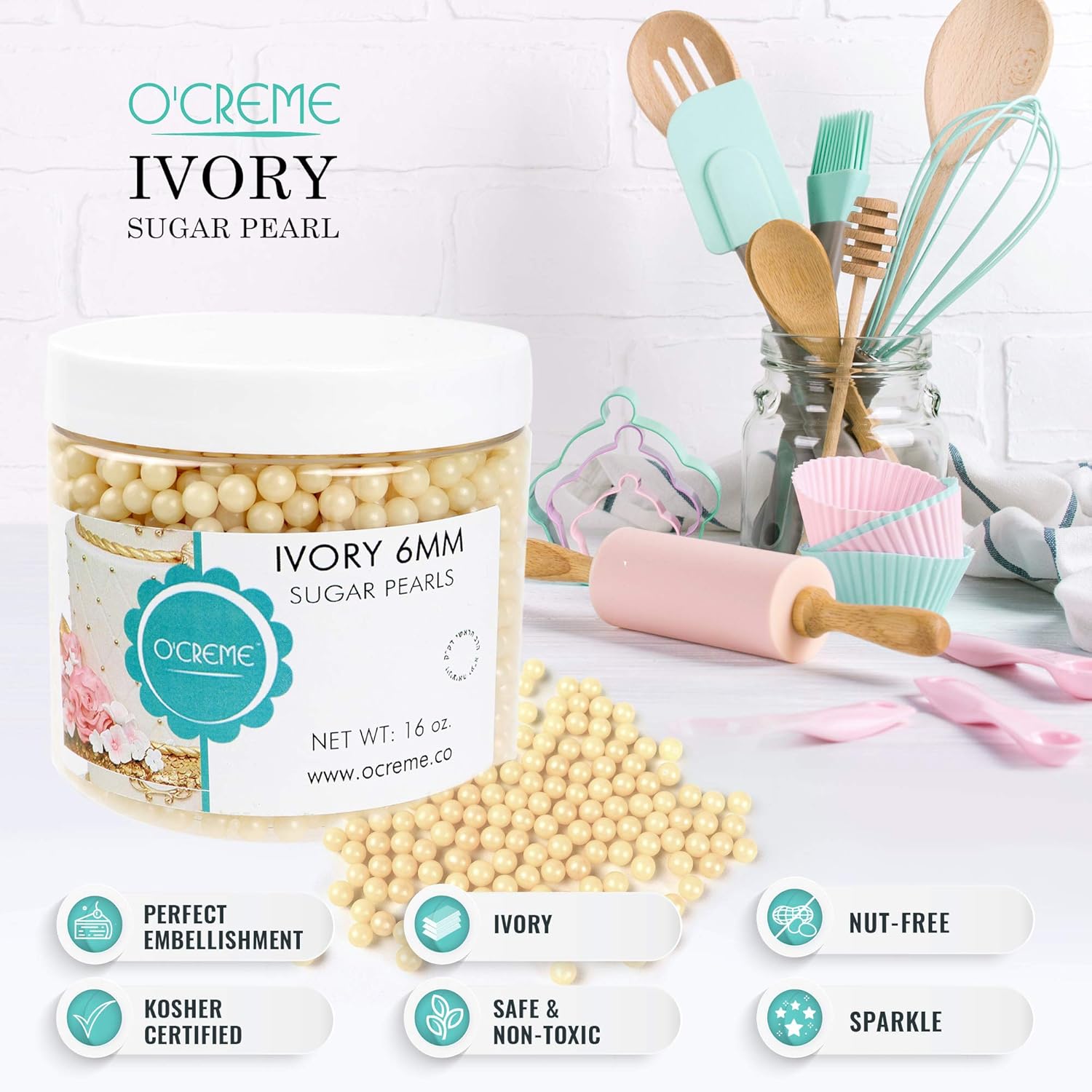 O'Creme Ivory Edible Sugar Pearls Cake Decorating Supplies for Bakers: Cookie, Cupcake & Icing Toppings, Beads Sprinkles For Baking, Certified, Candy Sugar Ball Accents (2mm, 8 Oz)