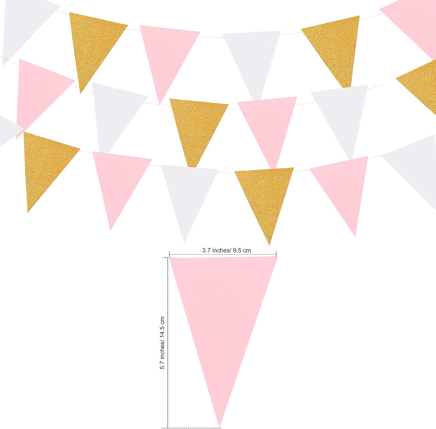 MerryNine Triangle Flag Bunting Banner, 3 Pack 30 Feet Vintage Style Pennant Banner for Wedding, Baby Shower, Event & Party Supplies 45pcs Flags (Triangle Flag - Pink White Gold Glitter)