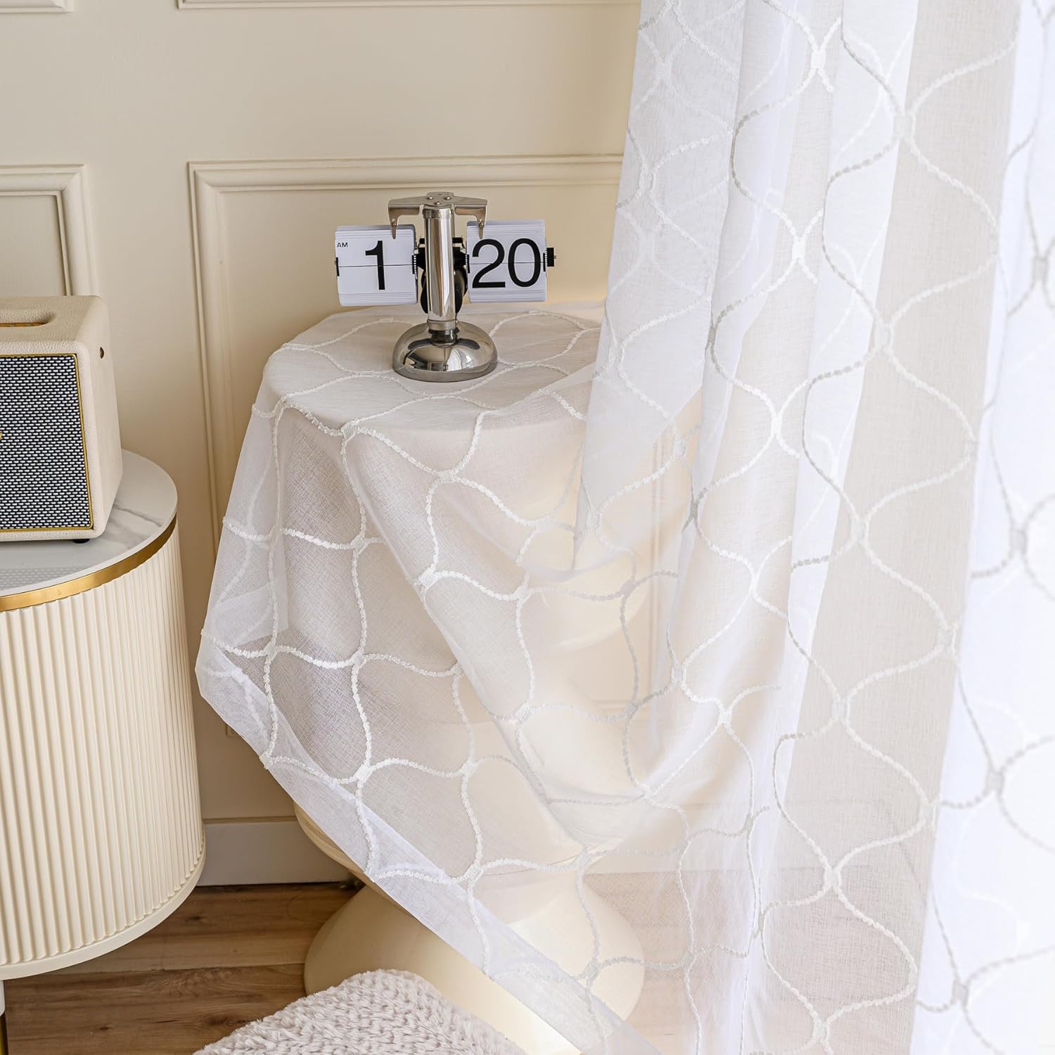 Sheer Curtains White 45 Inches,Wavy Diamond Embroidered Rod Pocket Voile Drapes for Living room, Bedroom, Window Treatments Semi Crinkle Curtain Panels for Yard, Patio, Parlor, 2 Panels, 52"x 45".