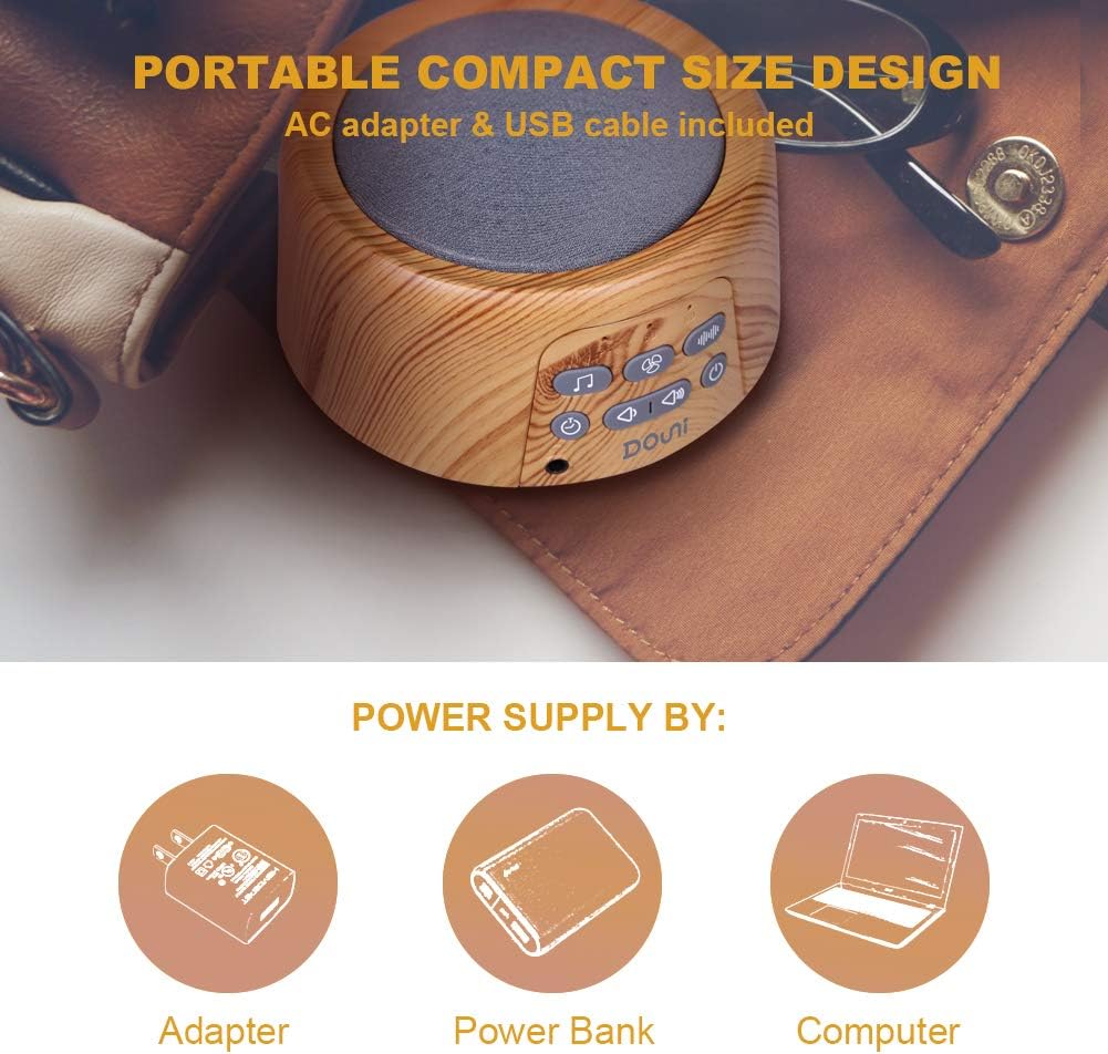 - AESTHETICALLY PLEASING & PORTABLE SIZE: Featuring stylish wood grain finish, this sound machine matches any decor at nursery room; office; bedroom; hotel room; kid’s room perfectly. This portable sound machine Weighing 9.7 ouces and measuring 2.3 inches high; this fits easily into your backpack or suitcase and makes it great for travel or in-office use to relieve anxiety and sleep better.