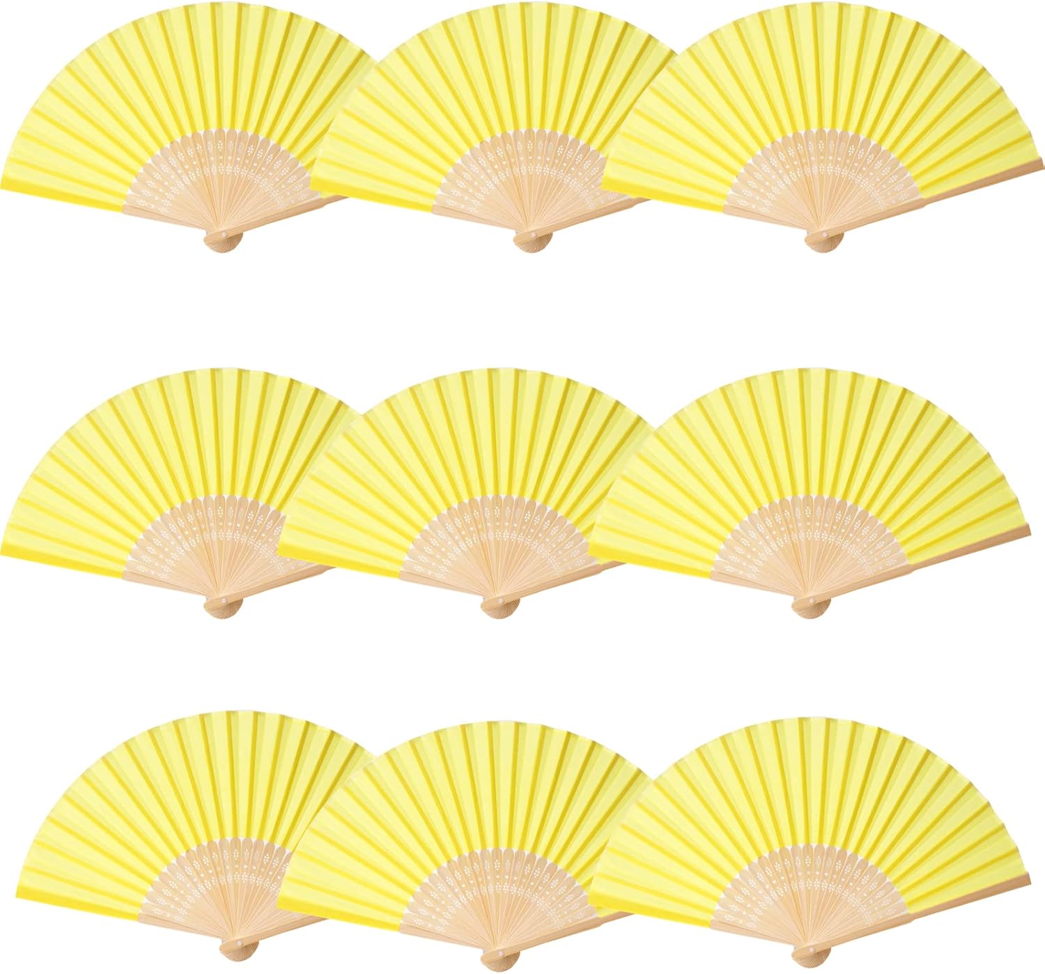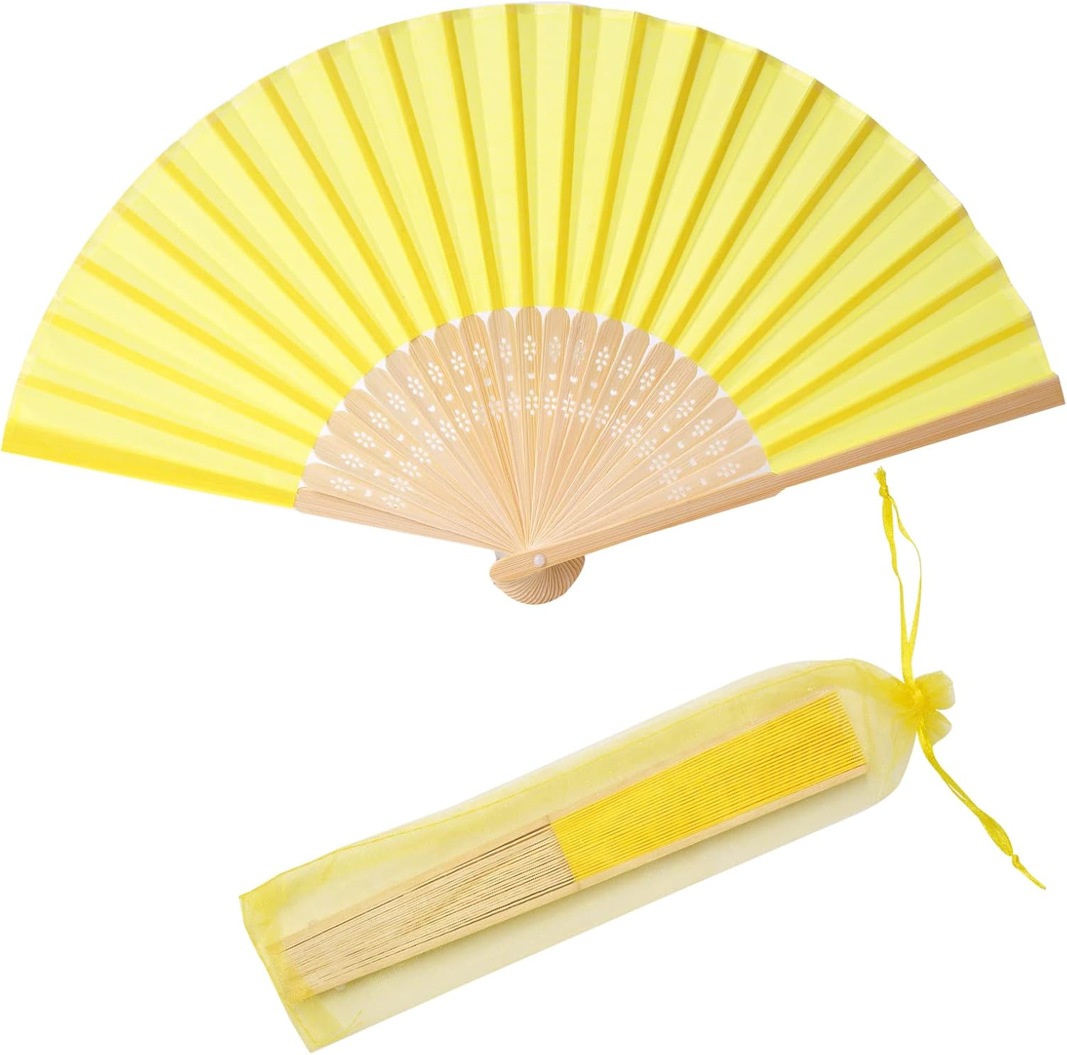 24pcs Imitated Silk Hand Fan Imitated Silk Fabric Bamboo Handheld Folded Fan Bridal Dancing Props Church Wedding Party Favors with Organza Bags (Yellow)