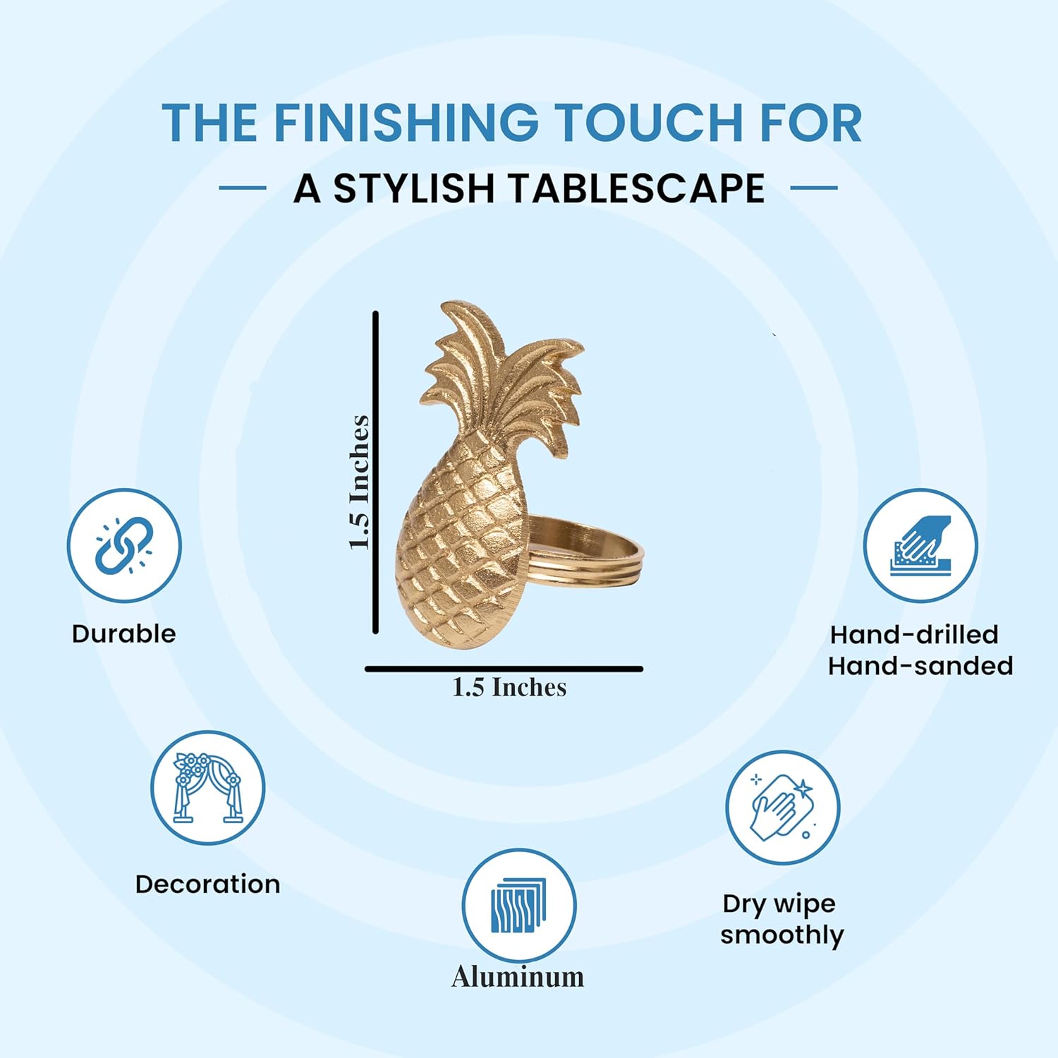 - ✅ SET OF 12 -COMPACT 1.5-INCH SIZE FOR STYLISH SETTINGS: Each pineapple-shaped napkin ring measures approximately 1.5 x 1.5 inches, the perfect size to wrap neatly around cloth or paper napkins. This pack of 12 is ideal for large family dinners, tropical parties, or themed gatherings.