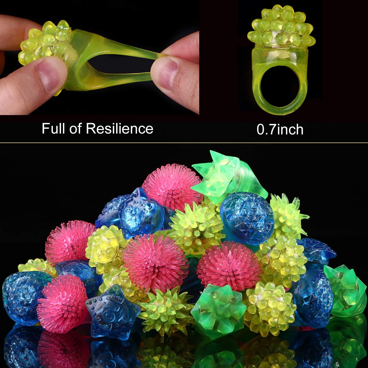 - 4 Color 6 Shape Eech: Party pack contains 36 light up rings. There are 6 shapes and 4 color red, blue, green and yellow of these bumpy rubber rings, cute party favors for kids and adults