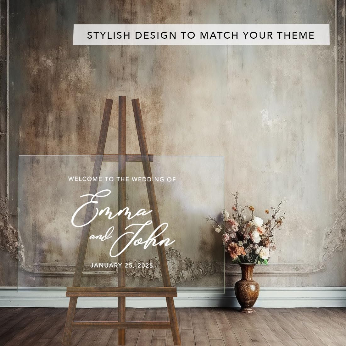 - Personalized Acrylic Wedding Welcome Sign: This acrylic wedding welcome sign features a customized couple’s names and event date in transparent background suitable for indoor or outdoor use; fits well into welcome sign flower box stands for floral themes; a suitable option for acrylic customized sign needs at formal gatherings; complements other welcome flower box sign displayed on tables or entryways; a reliable addition to wedding signs welcome collections