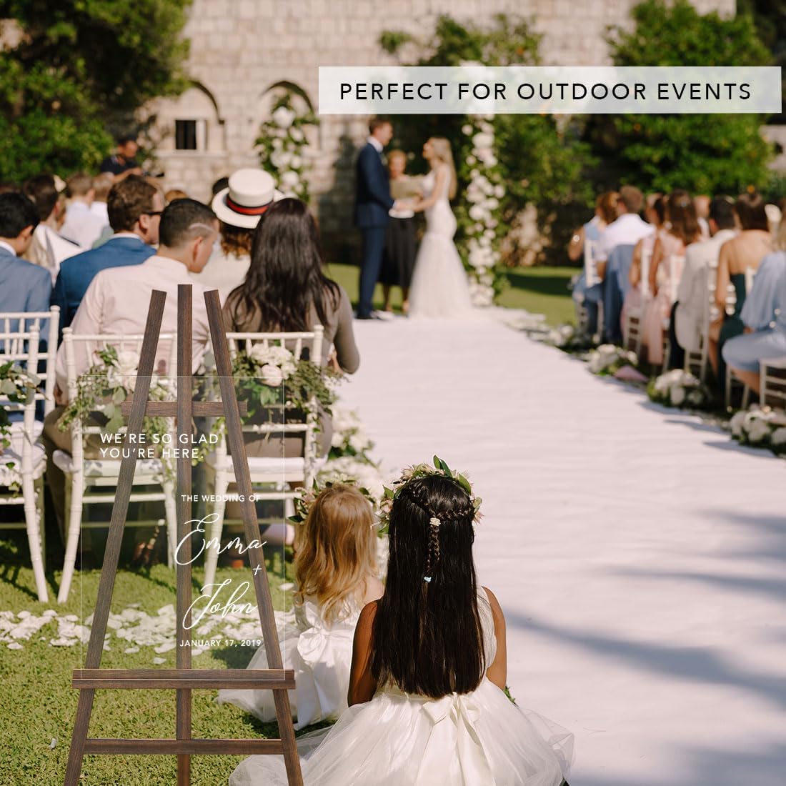 - RESILIENT CRAFTSMANSHIP FOR INDOOR OR OUTDOOR USE Constructed from high-quality, thick acrylic, our weatherproof wedding signs for ceremony and reception are built to withstand any weather, ensuring a lasting memento of your special day. Made of thick high quality acrylic with premium printed inks, our wedding outdoor sign do not fade or peel unlike vinyl signs.
