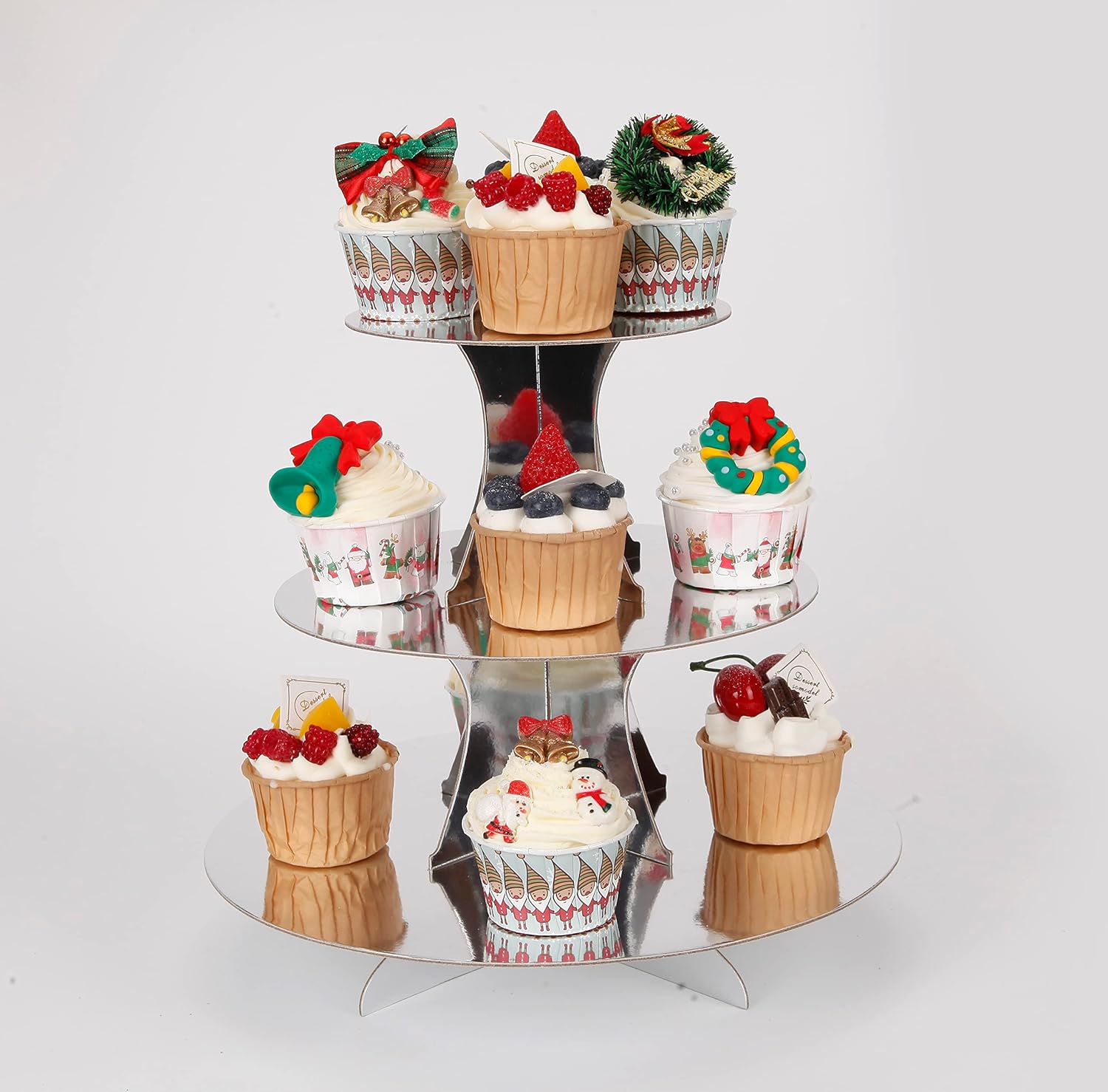 - 【Dessert Display】— This stacked 3-tier cupcake tower will be a big hit at your next party. Use this stand to display cupcakes, cookies, candies and fruit, or use it for appetizers like cheese and crackers. Three stacking sections disassemble easily and nest together for storage.