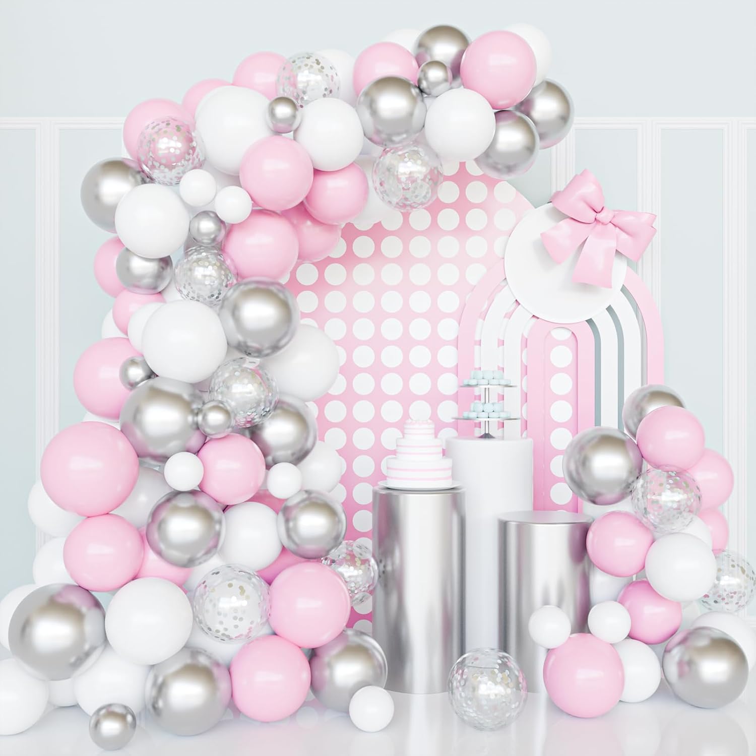 Silver Pink Balloons Garland Kit, 100pcs White and Silver Confetti Metallic Latex Balloons Arch with 16ft Tape Strip & Dot Glue for Girl Baby Shower, Birthday Party, Wedding, Anniversary Decorations