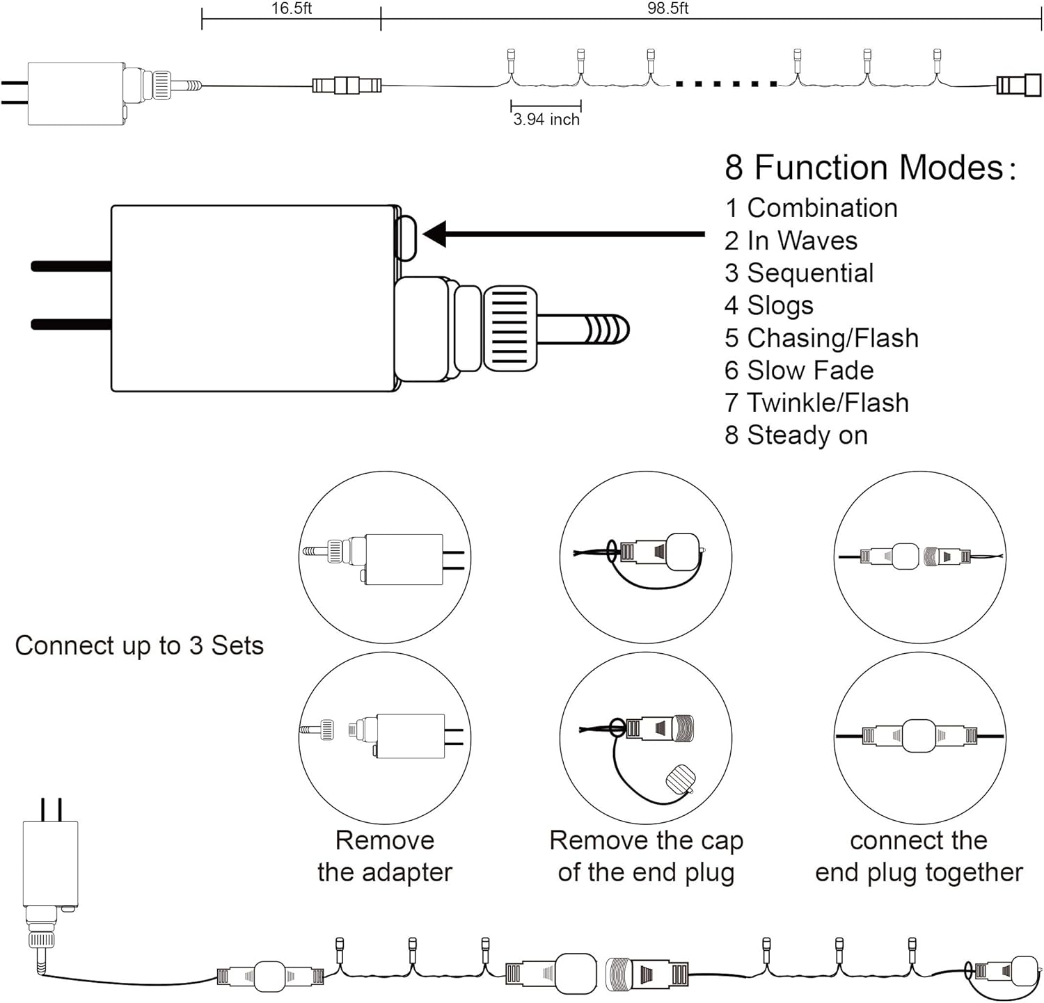 - 8 Lighting Functions: Our Halloween string lights have 8 lighting modes: combination, in waves, sequential, slogs, chasing/flash, slow fade, twinkle/flash, and steady on. Fit different occasions, moods, feelings, holidays, festivals, anniversaries, etc. Pressing the round button on the transformer to change the lighting modes.