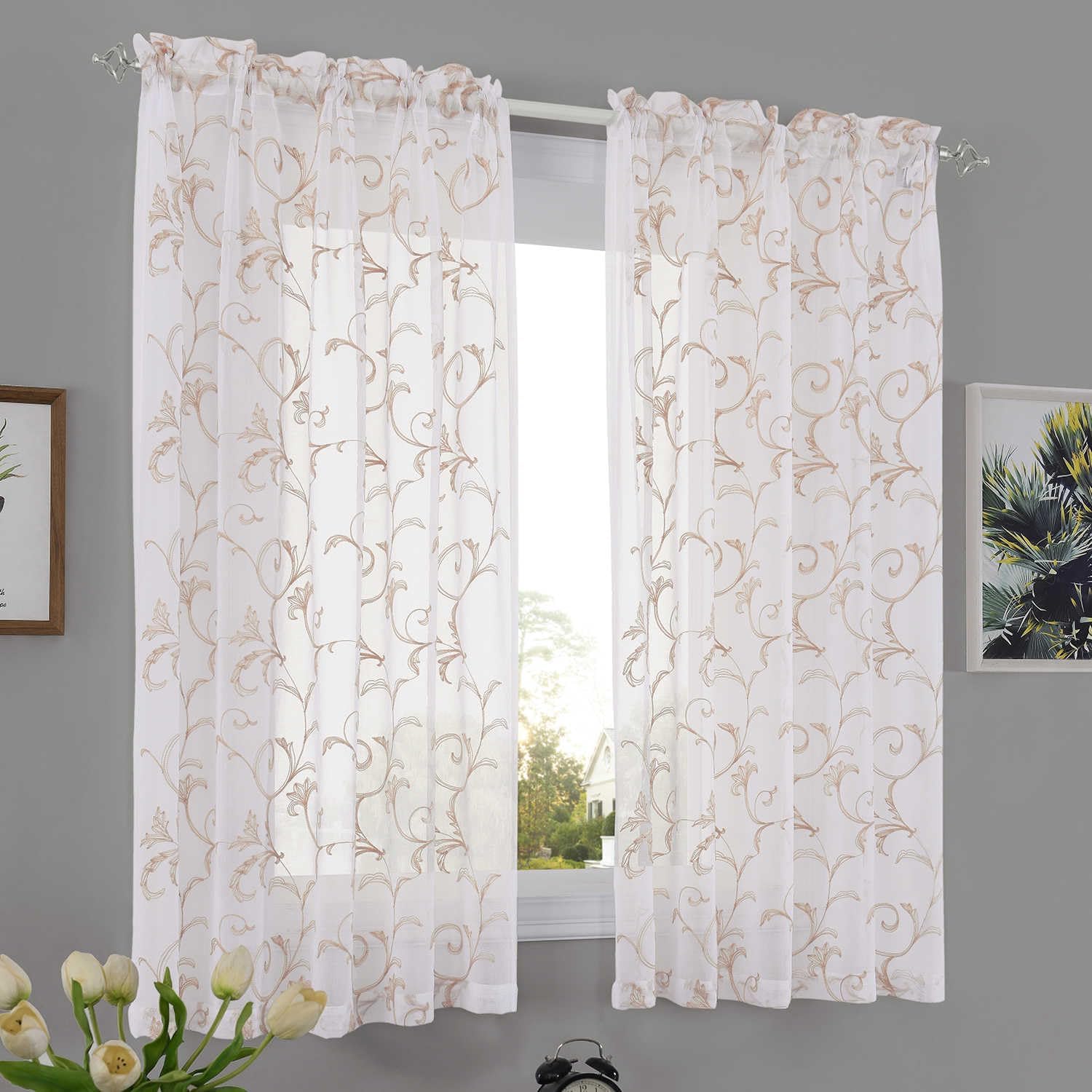 Sheer Curtains White-Beige 45 Inch Length Floral Embroidery Vintage Rod Pocket Voile Drapes for Living room, Bedroom, Window Treatments Semi Crinkle Curtain Panels for Farmhouse Set of 2, 52"x 45".