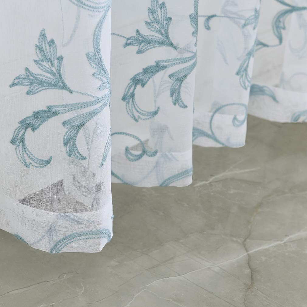 Floral Embroidery Sheer Curtains Blue 45 Inch Length, Vintage Rod Pocket Voile Drapes for Living room, Bedroom, Window Treatments Semi Crinkle Curtain Panels for Villa, Parlor, Set of 2, 52"x 45".
