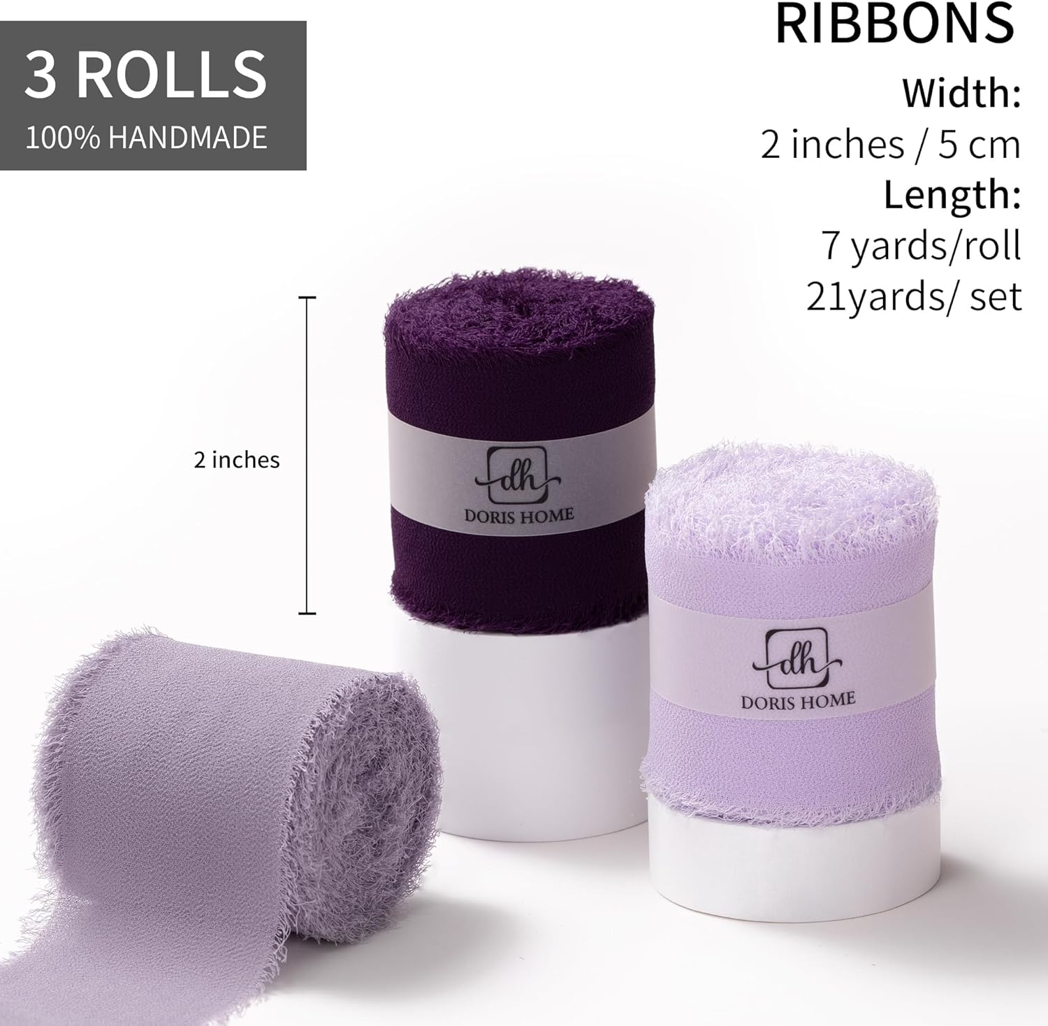 - 【Size and Color】Each roll of chiffon ribbon is 2 inches wide and 7 yards long, perfect for various creative uses such as making bows, decorating wreaths, and DIY crafts. This set includes plum, pastle purple, and light purple ribbons, one roll each. These vibrant frayed ribbons add a rustic charm to your creations, ideal for bouquet wrap or gift ribbon.
