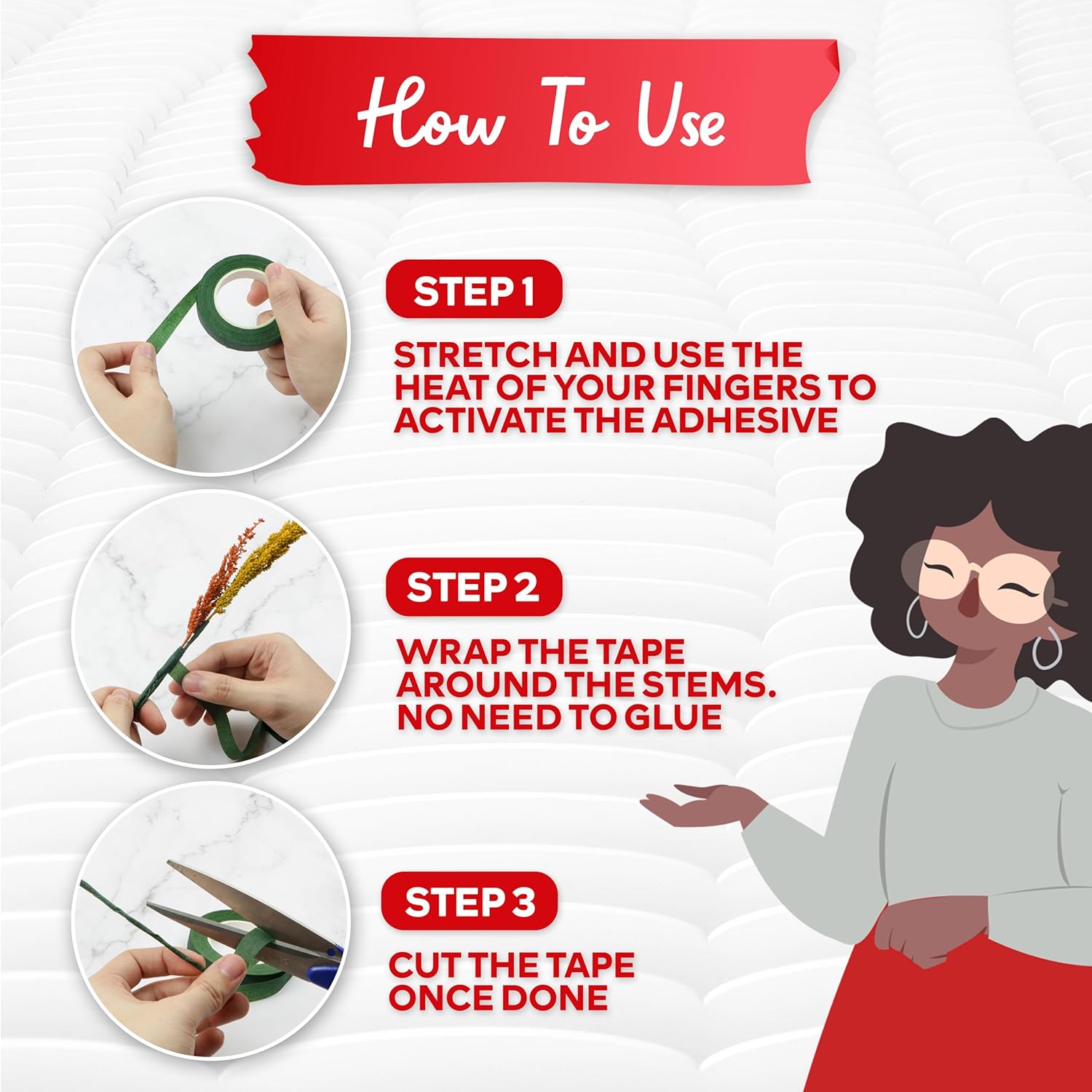 - Green florist tape features a mess-free and easy-to-handle wax layer that fuses to itself when stretched, resulting into neat applications, EMPOWERING the average user with LITTLE TO NO experience in flower and bouquet arrangement to ACHIEVE PROFESSIONAL-GRADE results!