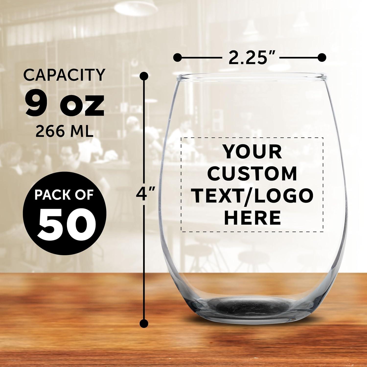 Custom Stemless Wine Glass 9 oz. Set of 50, Personalized Bulk Pack - Great for Wedding Favors, Bachelorette Party Decorations, Party Favors, Color Bottom - Black