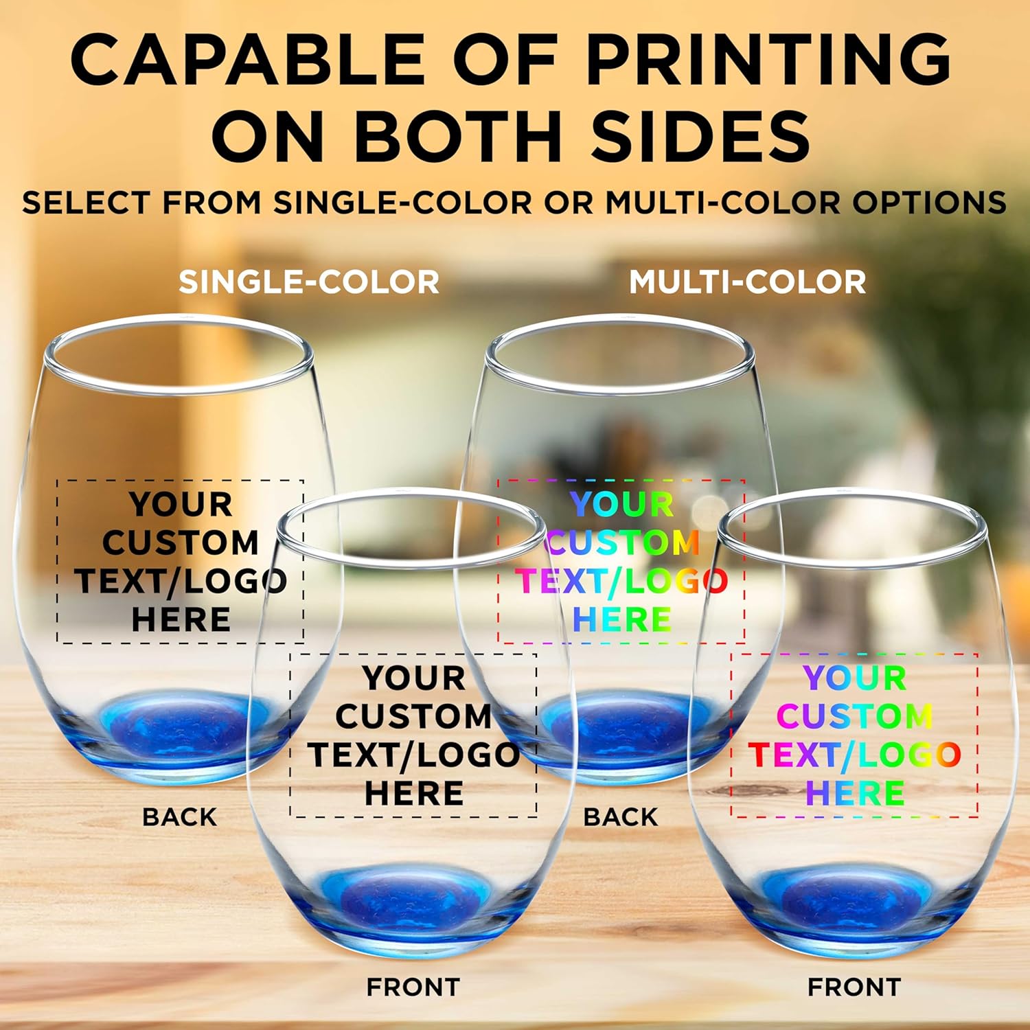 Custom Stemless Wine Glass 9 oz. Set of 100, Personalized Bulk Pack - Great for Wedding Favors, Bachelorette Party Decorations, Party Favors, Color Bottom - Blue
