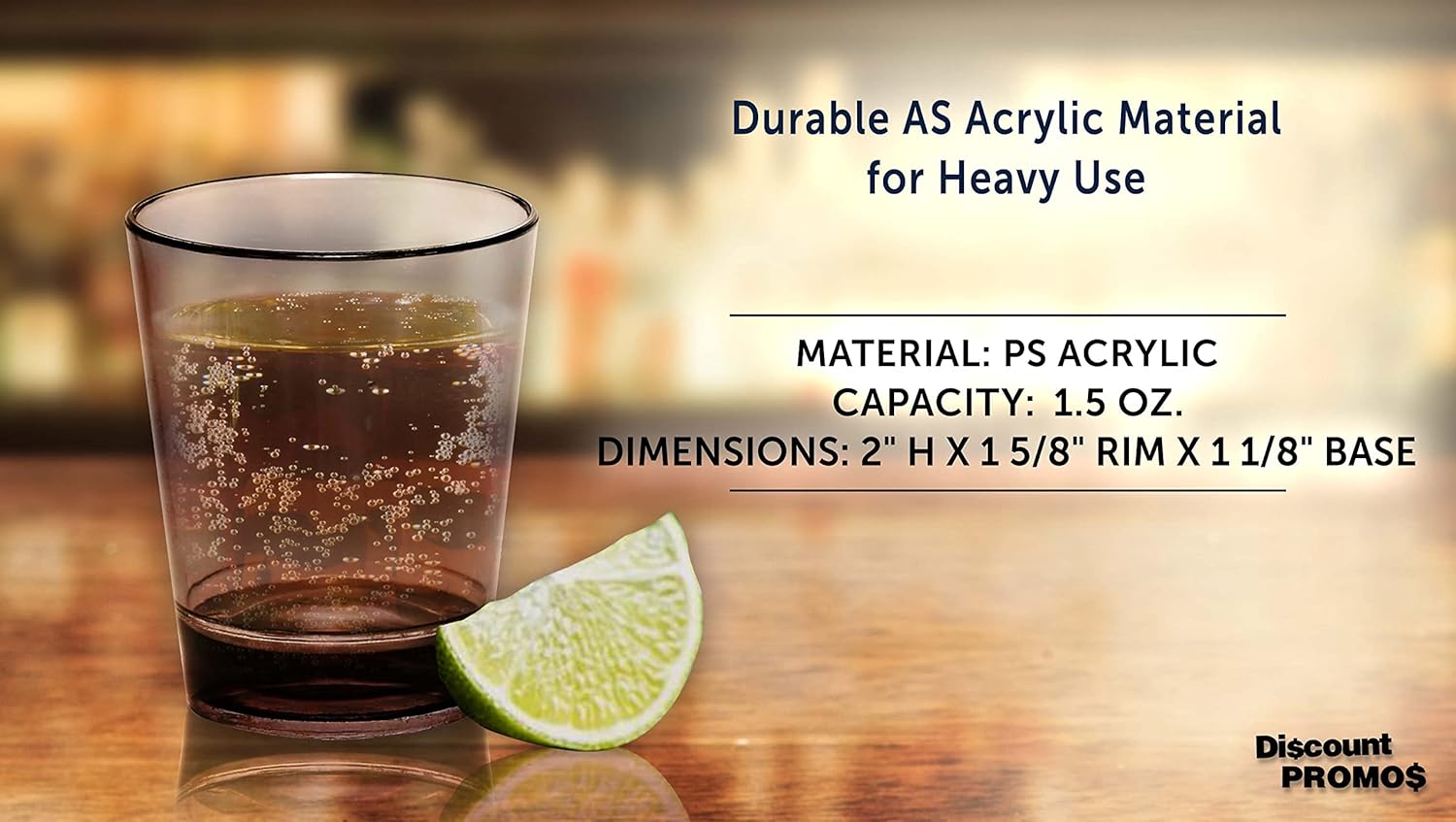 - DURABLE but INEXPENSIVE - These cheap shot glasses have thick bases along with a sheer rim to portray only the classiest look for your barware! 1.5 oz. Translucent Plastic shot glasses are strong so they won't crack, chip, or break easily. these cheap shot glasses have thick bases along with a sheer rim to portray only the classiest look for your barware!