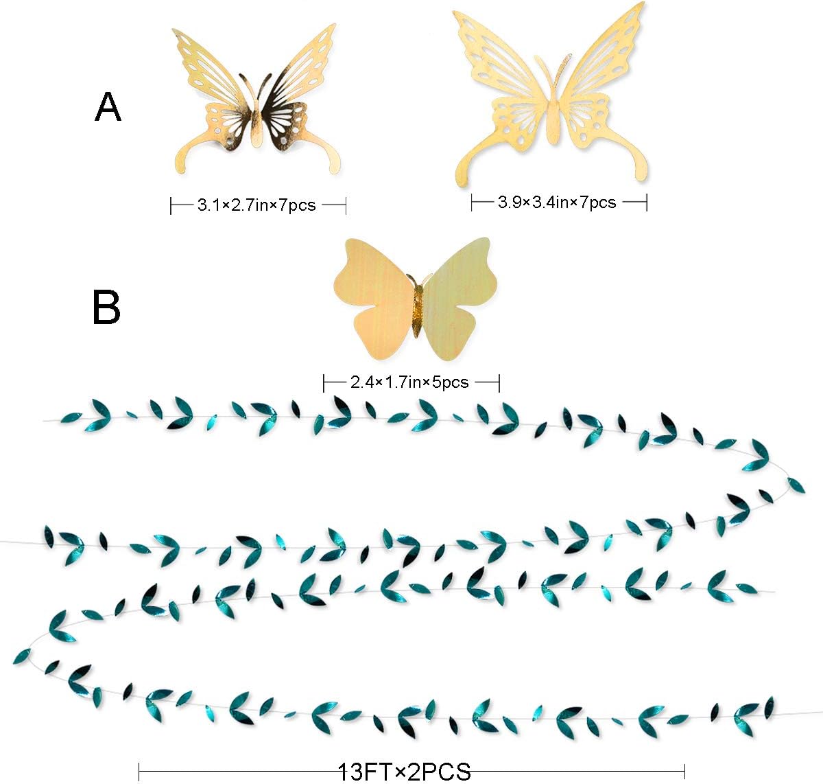 - Package Contains - 2× metallic emerald green leaves garlands,7×tissue paper flowers pom pom,4×tissue paper lanterns,24× gold butterfly decals,4×dark green ribbon.Total 41 pcs.