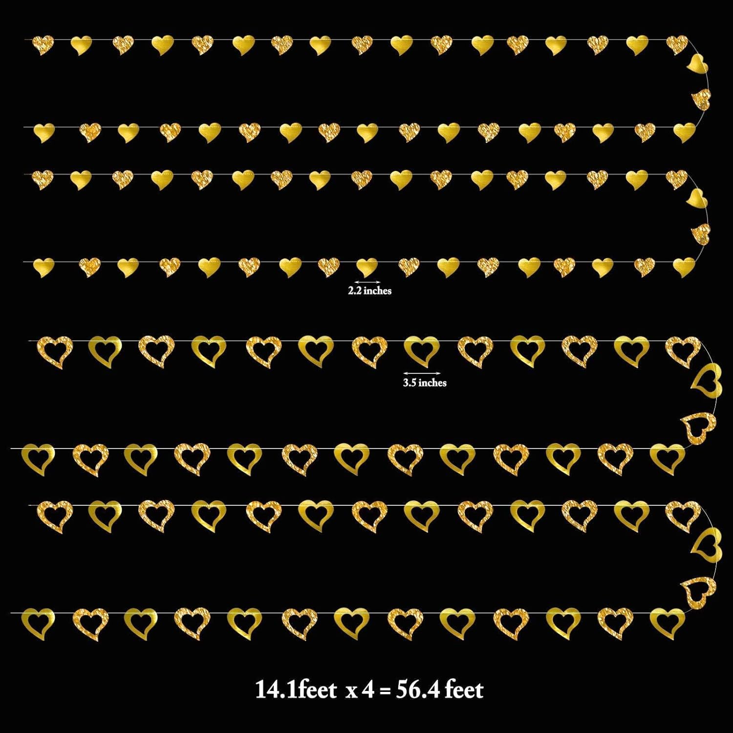 - Package: 2 sets of glitter gold heart garlands in two designs—smaller solid hearts (2 x 2.2 inches) and larger hollow hearts (3.2 x 3.5 inches). Each set includes two 14.1-foot-long garlands, totaling 56.4 feet in length. Made with shining cardstock and sewn with gold thread, these valentines day garlands add charm to any setting, from romantic events to everyday heart decorations.