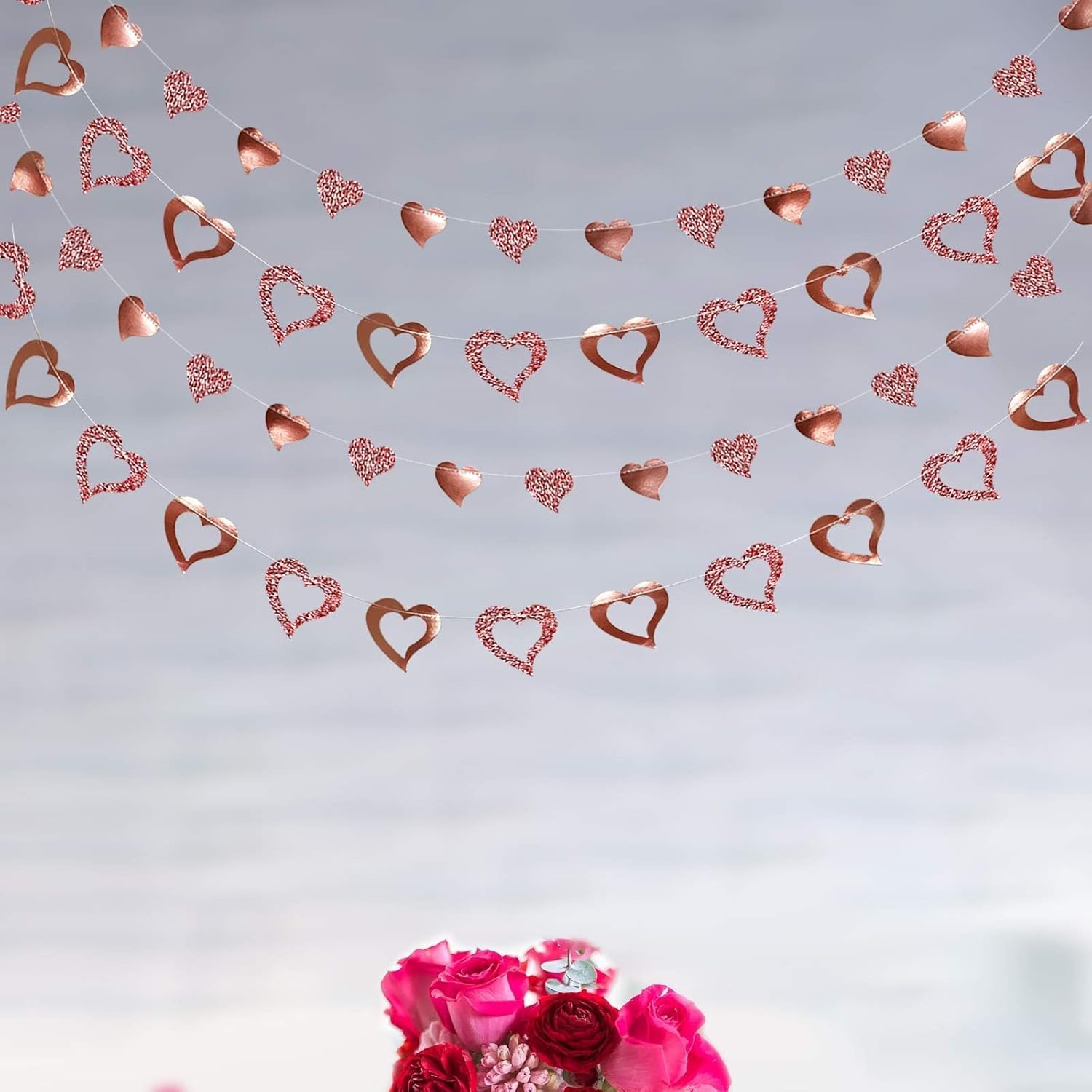 - Package Includes : 4 strings of 14 ft rose gold heart garlands, 2 strings are solid hearts of 2 x 2.2 inches and 2 are hollow-out hearts of 3.2 x 3.5 inches sewn together. Totally 56 ft. The hearts are made of glittering and shining paper.