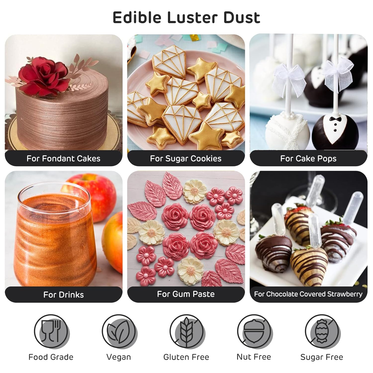 - WIDELY USED FOR BAKING -- The luster dusts is ideal for decorating fondant, gumpaste, royal icing cookies, buttercream, chocolate, candy apple, macaroons, cakes and so on; You can also create shimmery cocktails, champagne or any drink by adding a little edible luster to your beverage, have some fun