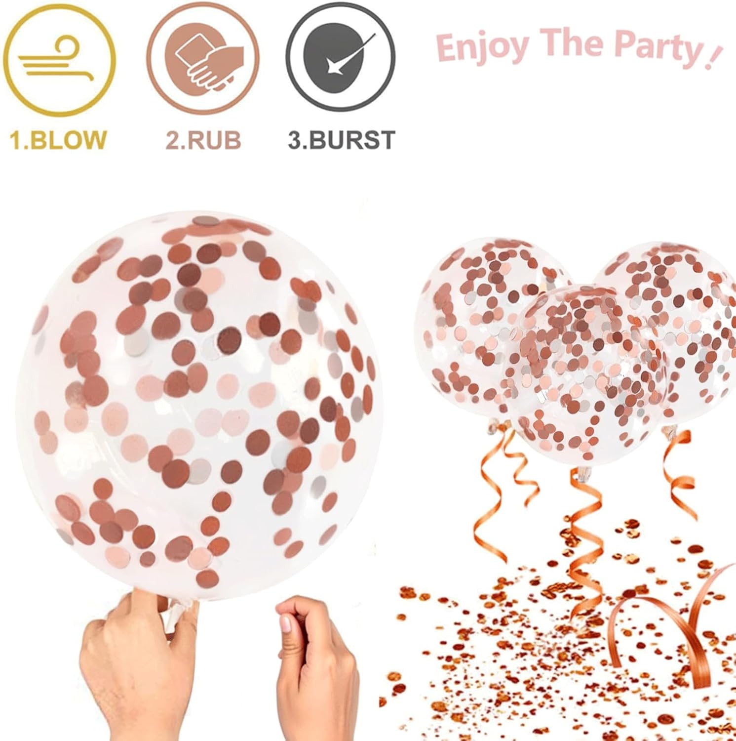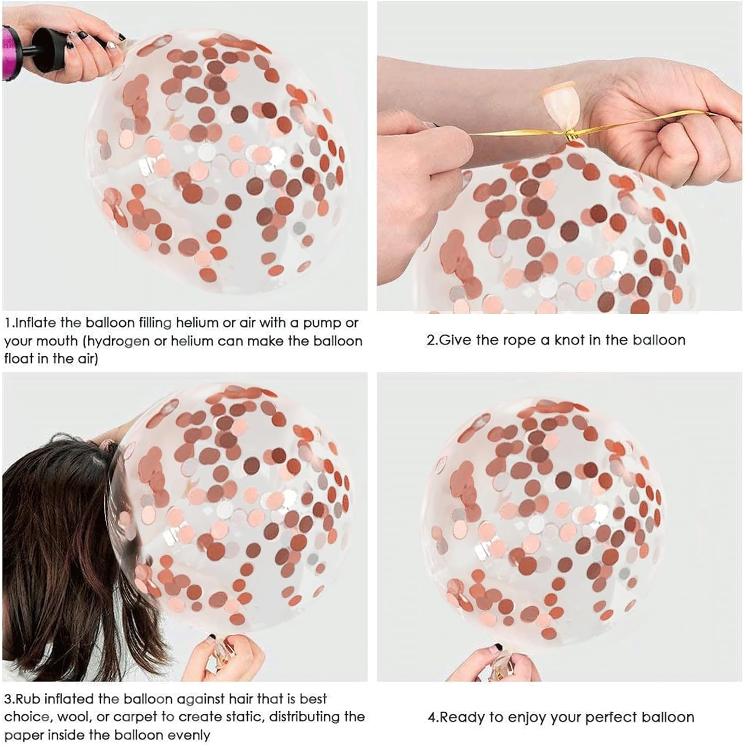 - ă Confetti Balloonă- Due to the rose gold confetti is heavier than helium, the confetti moves in the direction of gravity. Rubbing the outer side of the balloon on the hair (the best way )or silk, wool, will help the confetti stick to the balloon. A balloon pump is strongly recommended. This will make the balloons look more beautiful.