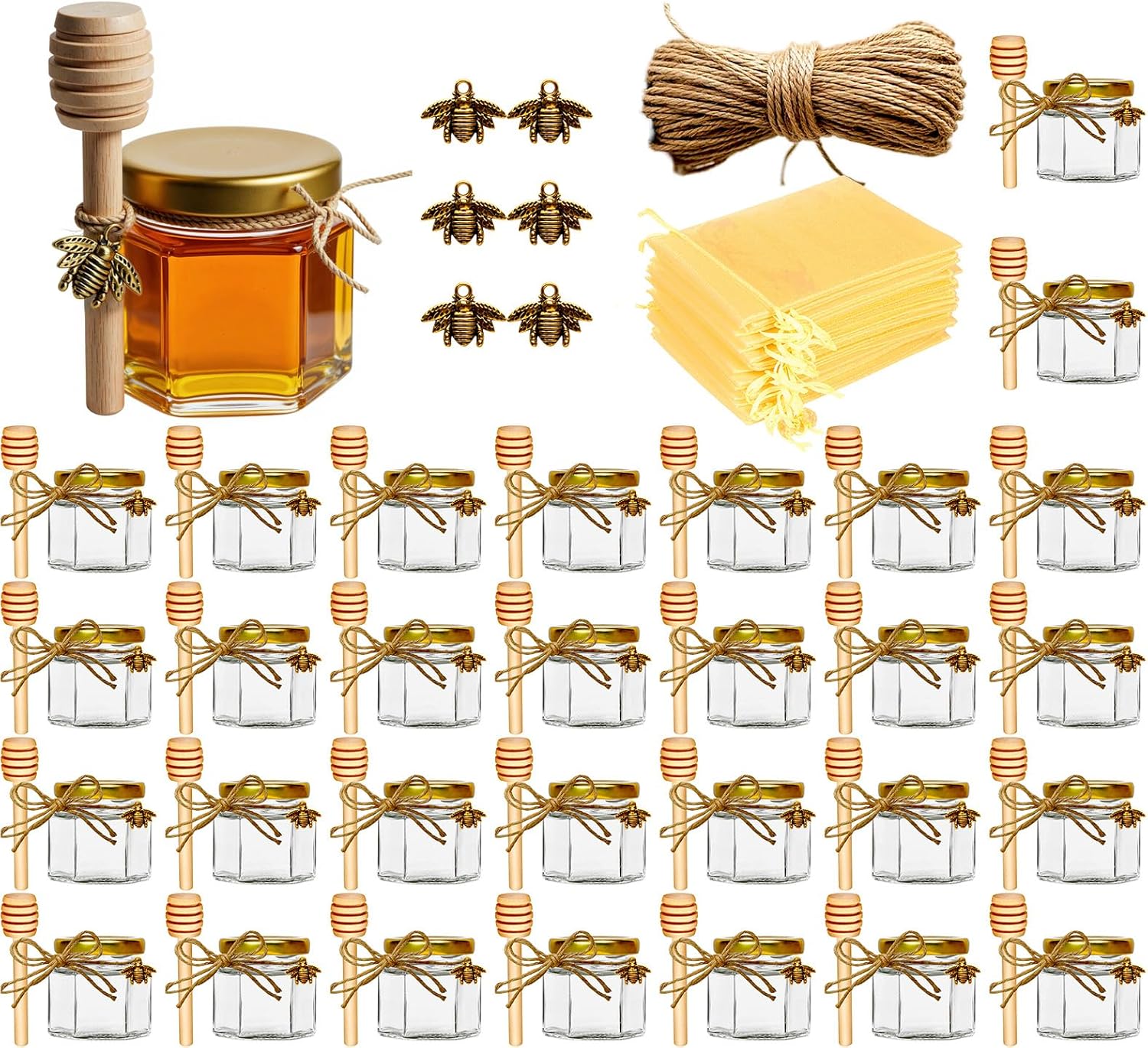 - What You Will Get - Our 2oz glass honey pot is come with Bee-Themed Accessories, including 15 pcs glass honey jars and wood dippers, 15 pcs gold lids, 10m jutes, 15 pcs bee charms, 15 pcs gold gift bags and 15 pcs thank-you tags