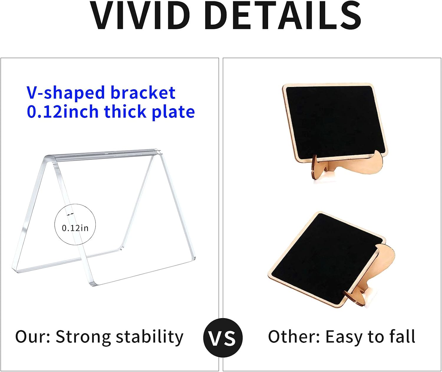 - STURDY AND CLEAR MATERIAL - Our mini chalk boards signs are made of sturdy acrylic material. This material is durable, super clear and transparent, very bright and beautiful, not easy to be damaged. The acrylic board has a thickness of 0.12inch, high stability, and is not easy to tip over.