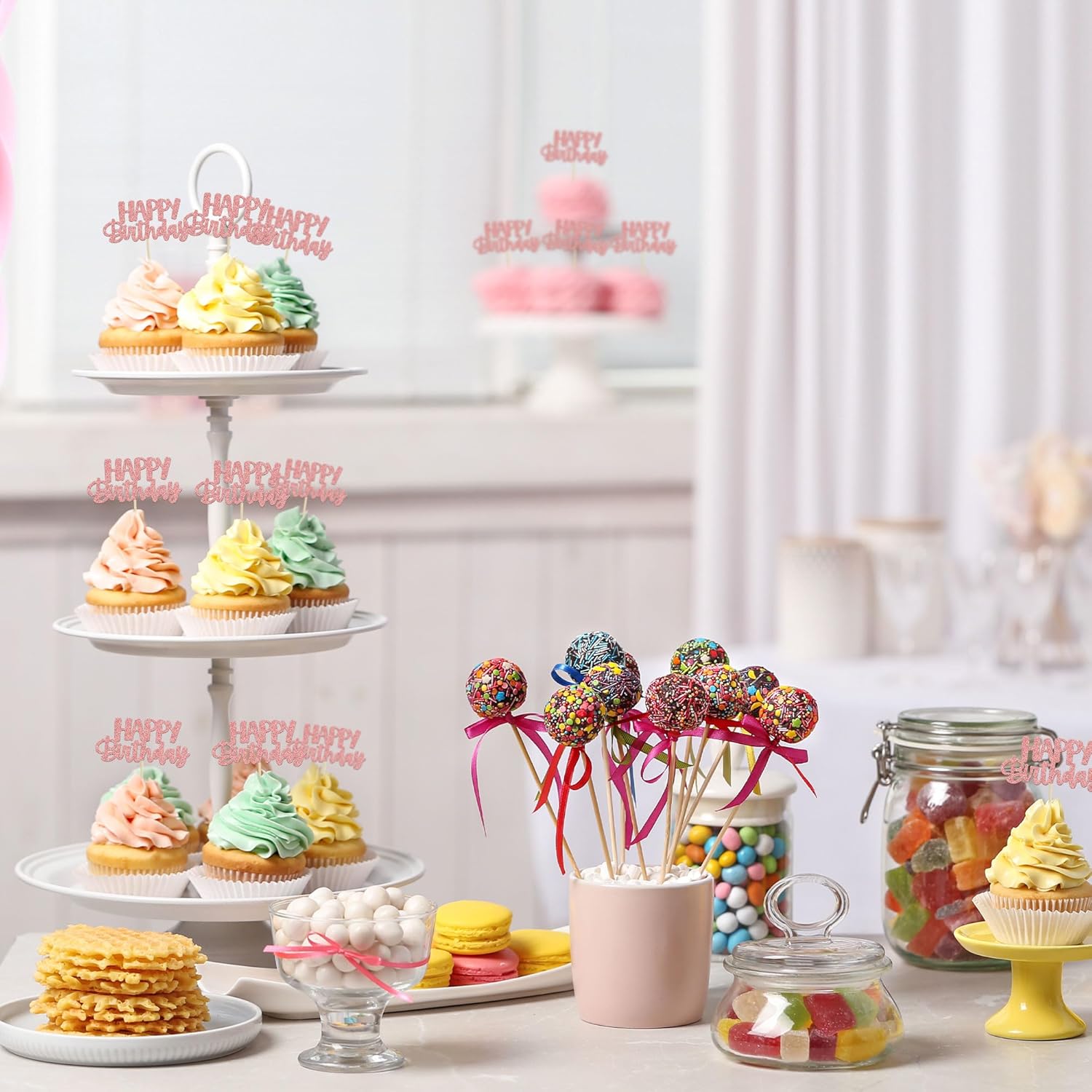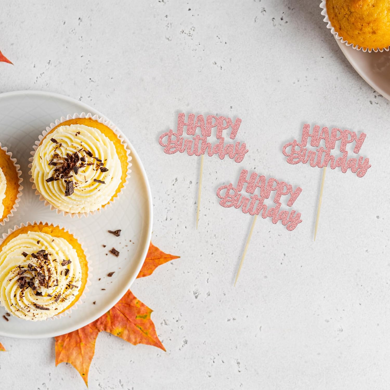 Gyufise 24Pcs Happy Birthday Cupcake Toppers Rose Gold Glitter Birthday Cake Picks for Celebrating Birthday Party Baby Shower Party Decorations Supplies