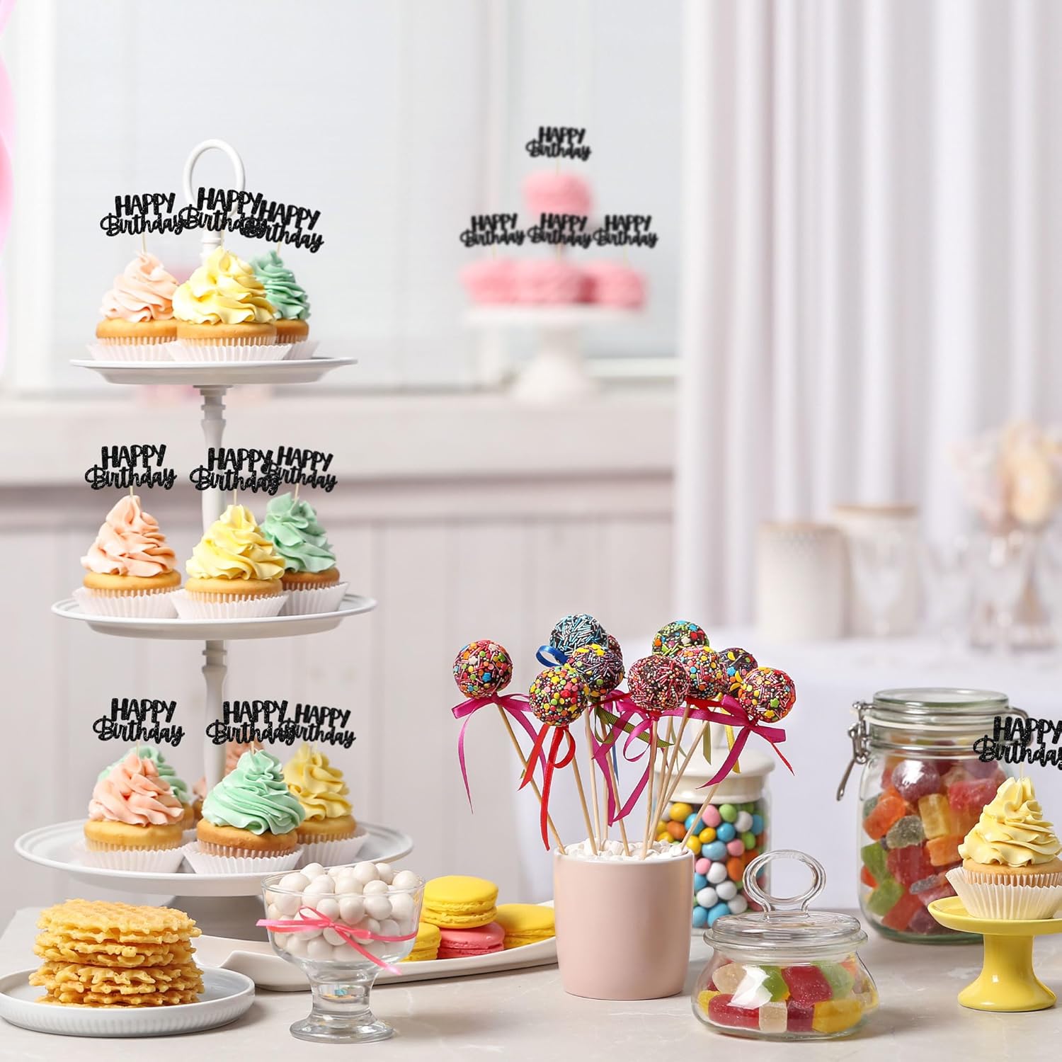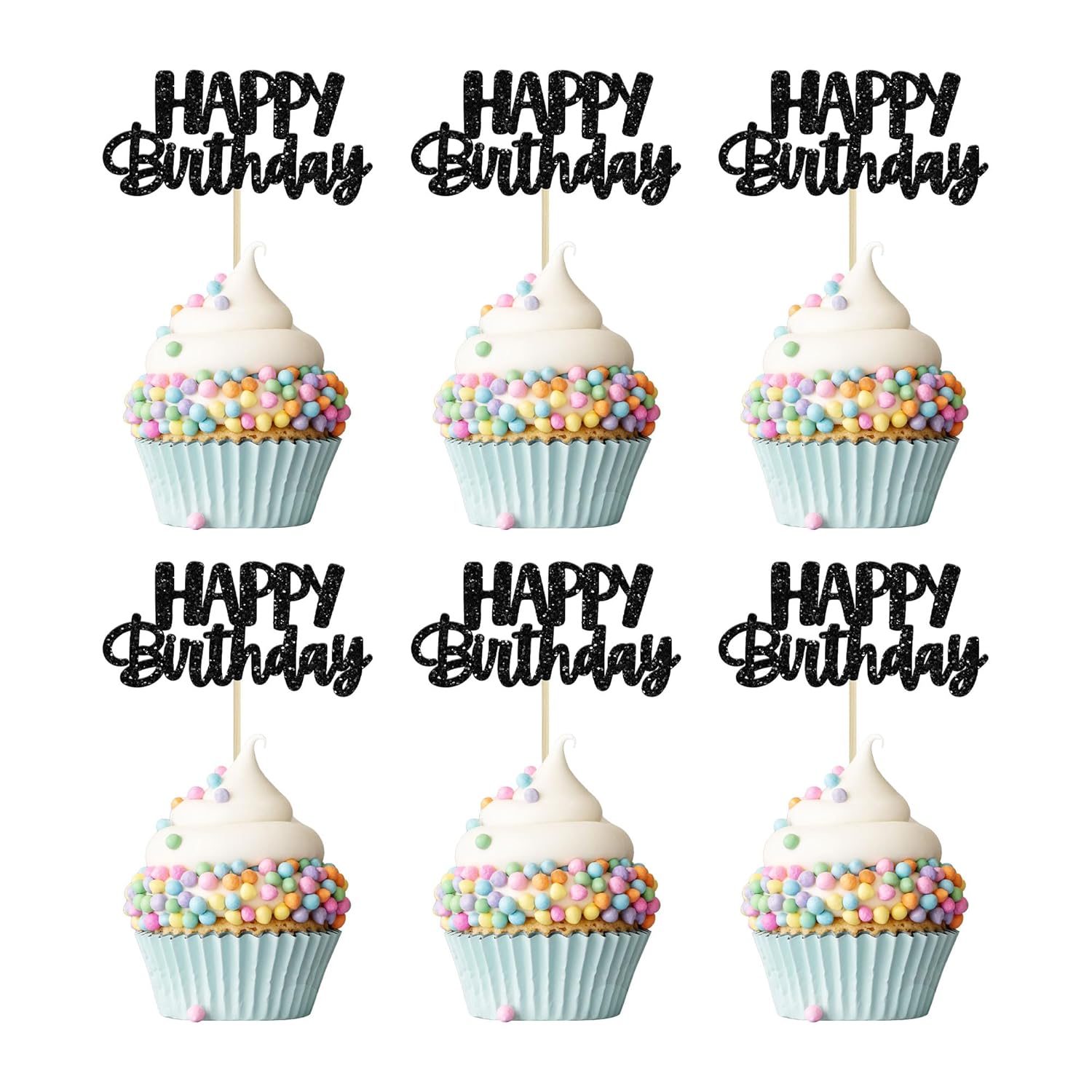 Gyufise Happy Birthday Cupcake Toppers Black Glitter Birthday Cake Topper Picks Dessert Topper Decoration for Birthday Party Anniversary Celebration