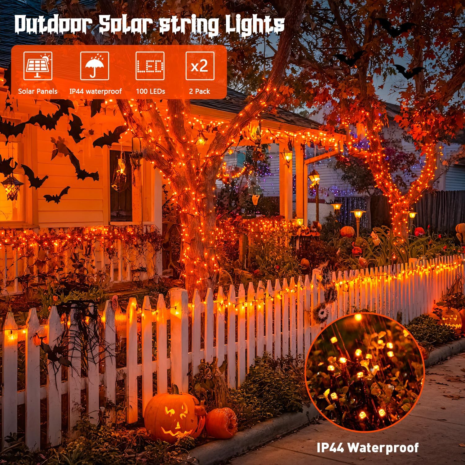 JMEXSUSS 2 Pack Orange Halloween Lights: 100 LED 33ft Solar Halloween Lights Outdoor Waterproof - 8 Modes Orange Solar Light for Christmas Outside Tree Gardens Fall Festival