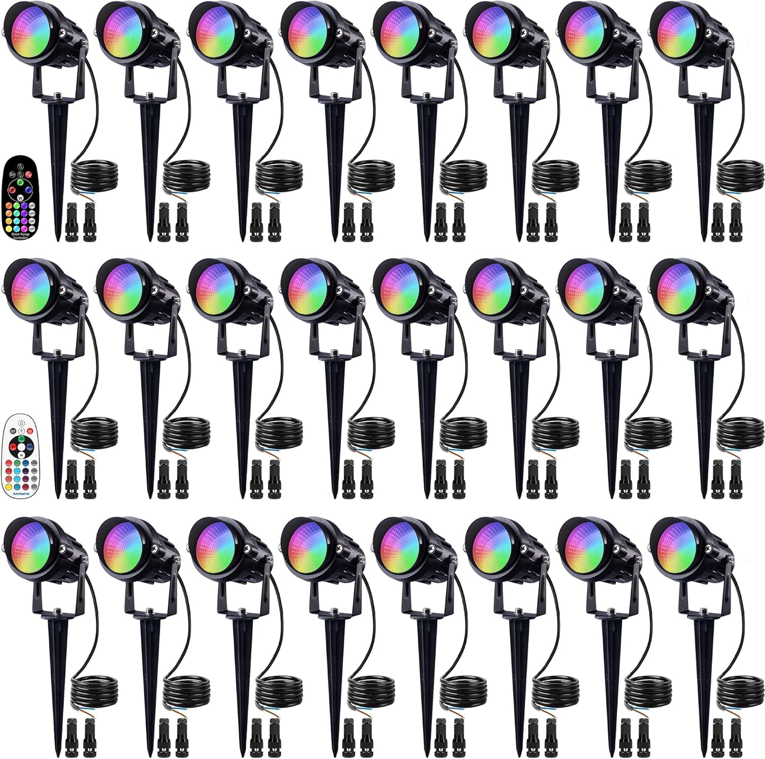 - 【RGB Landscape Lights with RF Remote Control】 24 pack 12W RGB low voltage landscape spotlights with die-cast aluminum casing and metal stakes. Including 2 remote controls, 1 with a control range of 19in for individually controlling each light. Another control range is 50ft for controlling multiple lights simultaneously. Perfectly decorate your court yard, tree, house, fence, Wedding, Christmas, Halloween.