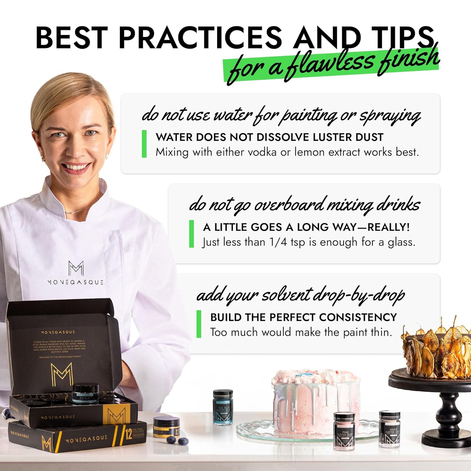 - EASY TO USE: Our green luster dust is incredibly versatile. Apply with a wet brush, airbrush, or dry brush, and even mix into beverages. Achieve professional-looking results effortlessly at home, whether decorating halloween cakes or adding shimmer to cocktails.