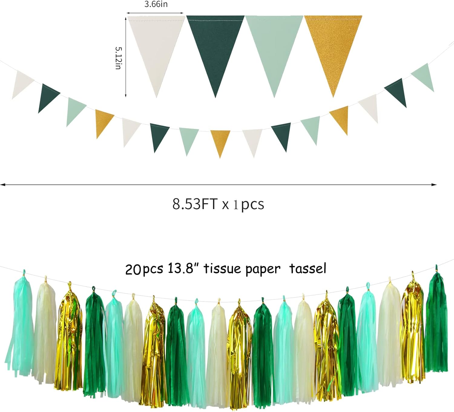 - 【Sage-Green Beige Gold Party Kits】The party decorations kits include 8pcs tissue paper flowers: 4pcs 8" and 4pcs 10" in three color, 1pcs Triangle Flags,1pcs circle dots paper garland, 20pcs tassel garland. Total 30pcs.