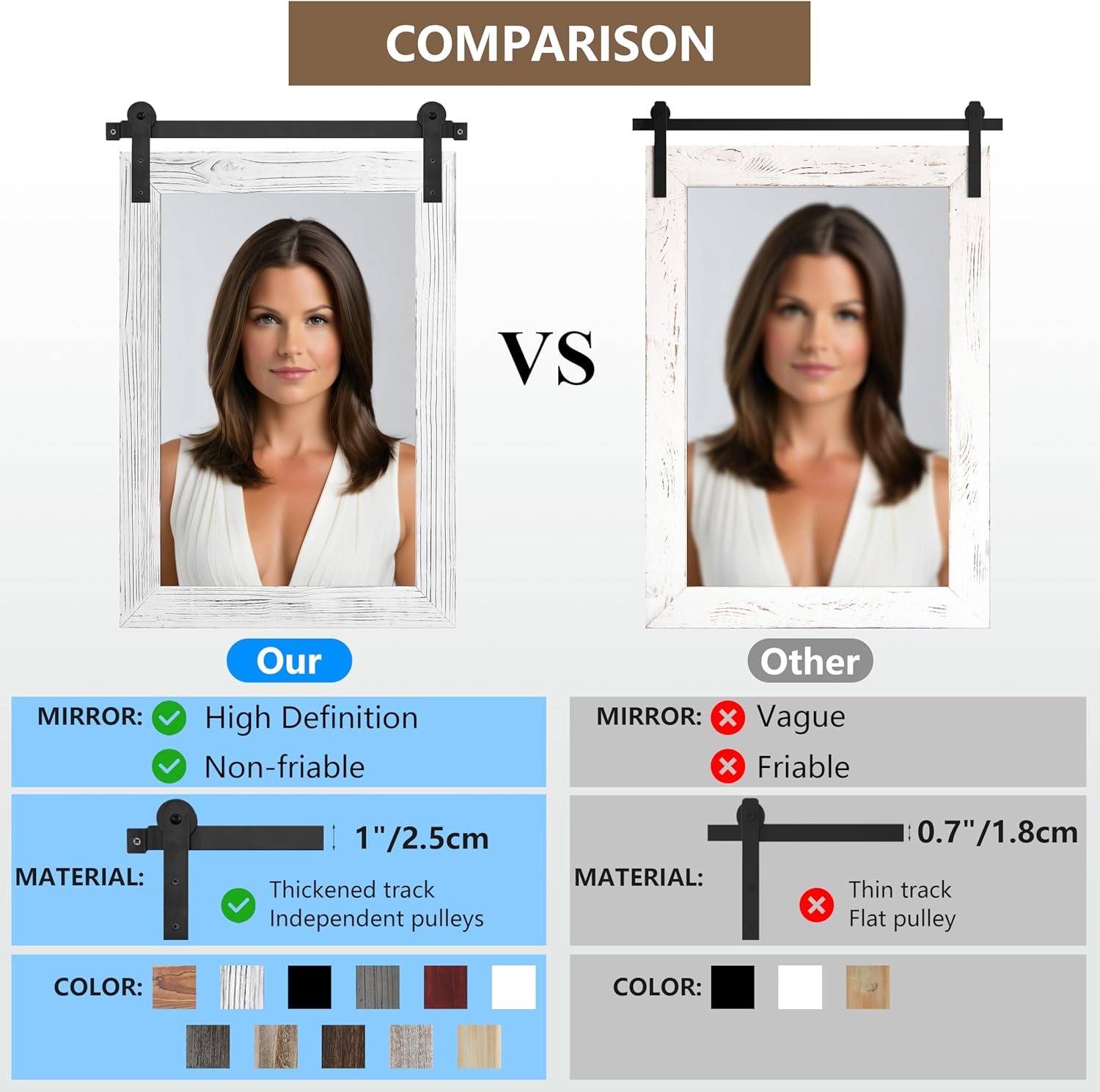 - QUALITY MATERIALS: The frame of the barn door mirror consists of an antique solid wood frame and a sturdy metal bracket. The interior features a 4mm HD silver mirror with clear and distortion-free reflections, providing a better sense of light and projection in your space