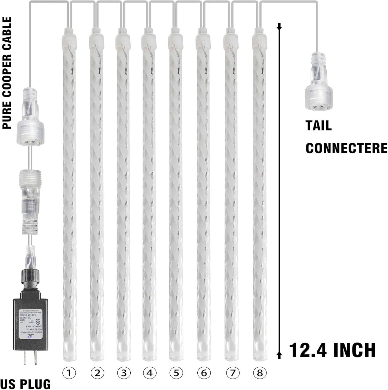 - Dimensions: Each Dazzle Bright Independence Day meteor shower rain light has 8 tubes, each tube is 30 cm / 12 inch long, each tube is independent from other tubes. The string wire between eath tube is 14 inch, each light has 16.4 FT lead wire, allow you to connect the power conveniently