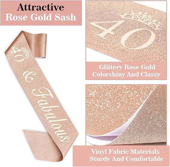 - 40th Birthday Sash for Women: Our 40th birthday sash is made of high quality glitter fabirc with foil lettering. The sash is in 63 inch length and comes with a gold charm pin that you can easily adjust the length you need