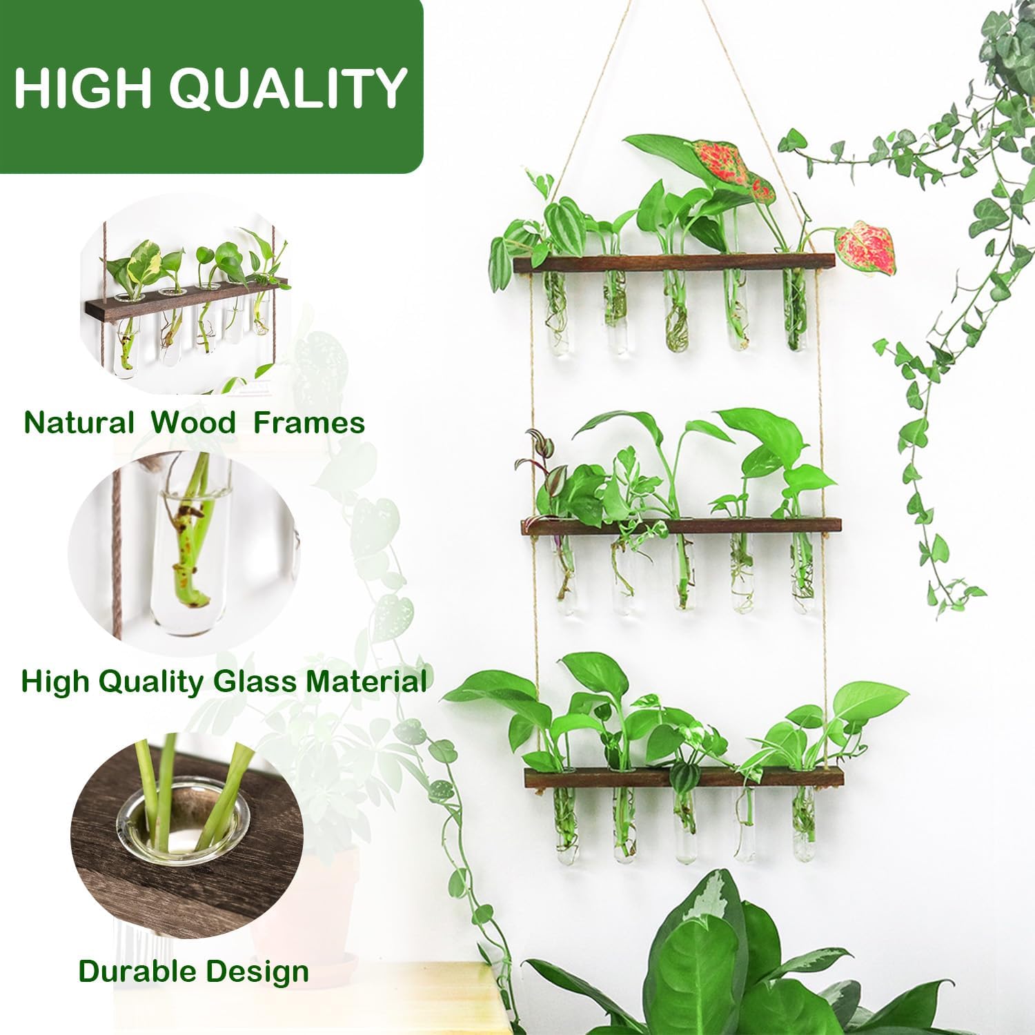 - Hanging Terrarium: Simple and elegant style test tube propagator suit anywhere. The three tiered wooden holder with 15 tubes maximizes space and hold more planindividuals cutttings, perfect for keeping cuttings neat and out of the way. It adds nice touch to your house, hanging it beside the window, wall for decoration in livingroom, dingroom, kitchen, dormitory and balcony.