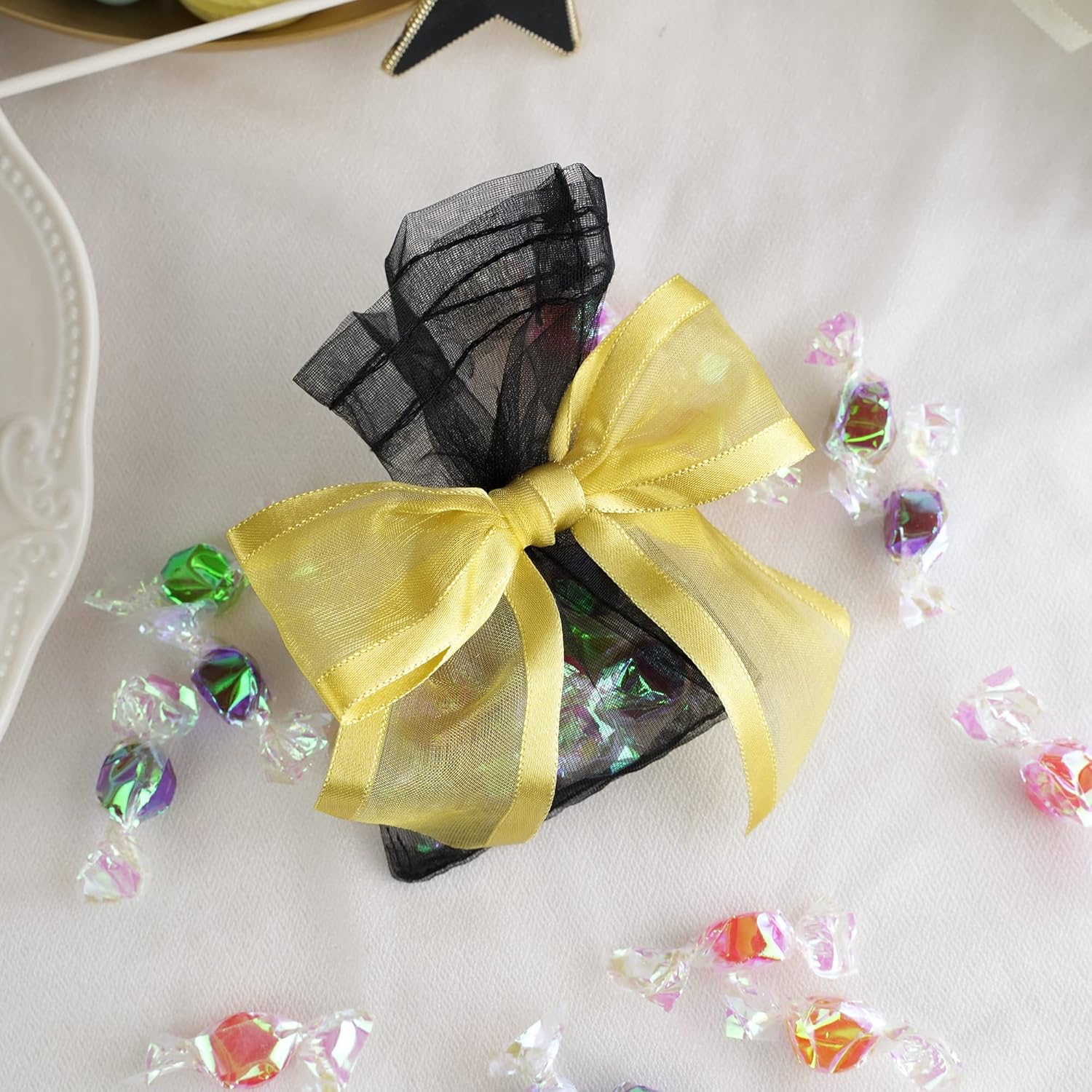 - PRETIED RIBBON BOWS- Decorative bows is made of 1-1/2'' gold organza satin edge ribbon with romantic transparency and glossy lustre, easily adding a elegant final touch to your party favor, cake pop bags, gift basket