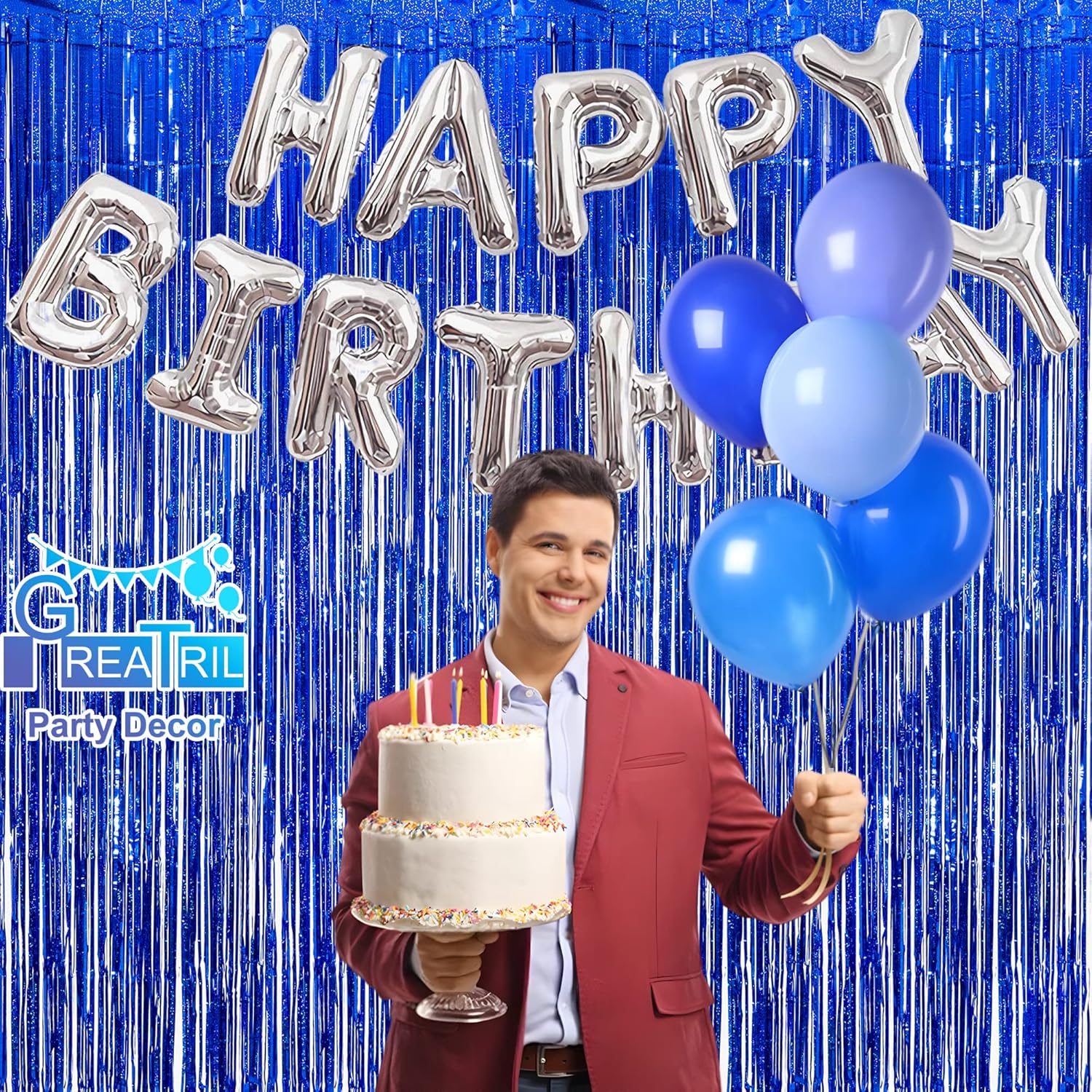 - GREATRIL Brand 8.2ft x 3.2ft dark blue foil fringe curtains 2-pack, this dark blue tinsel foil fringe curtains can make your party atmosphere fuller and more enjoyable.