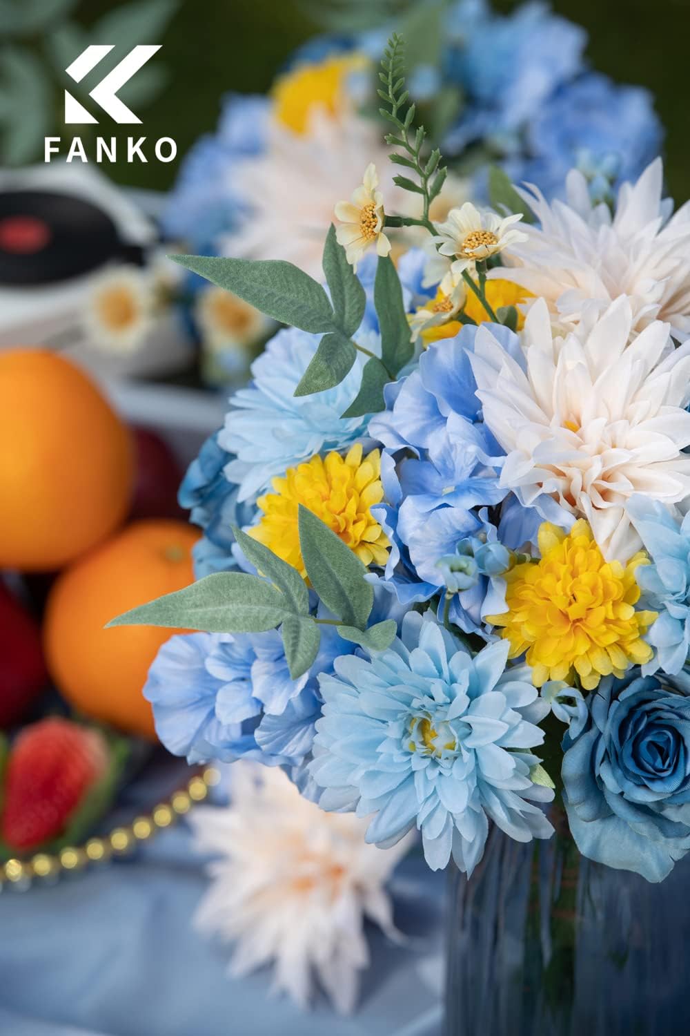 - ❤️ 【47Pcs in Package】Our artificial flowers combo includes: Cream Semi-Cactus Dahlia x 2 (5.5"), Sky Blue Dahia x 4(4"), Dusty Blue Silk Rose x 5(3.5"), Hydrangea Flowers x 3 (4.5"), Yellow Chrysanthemum Ball x 4(2.5"), Daisy x 12 (1.5"), Rose Buds x 12(0.5"), With Leaf x 3, Nandina Plants x 2. [Notes: Ribbons are not included. Colors may vary slightly due to differences in monitor settings.]