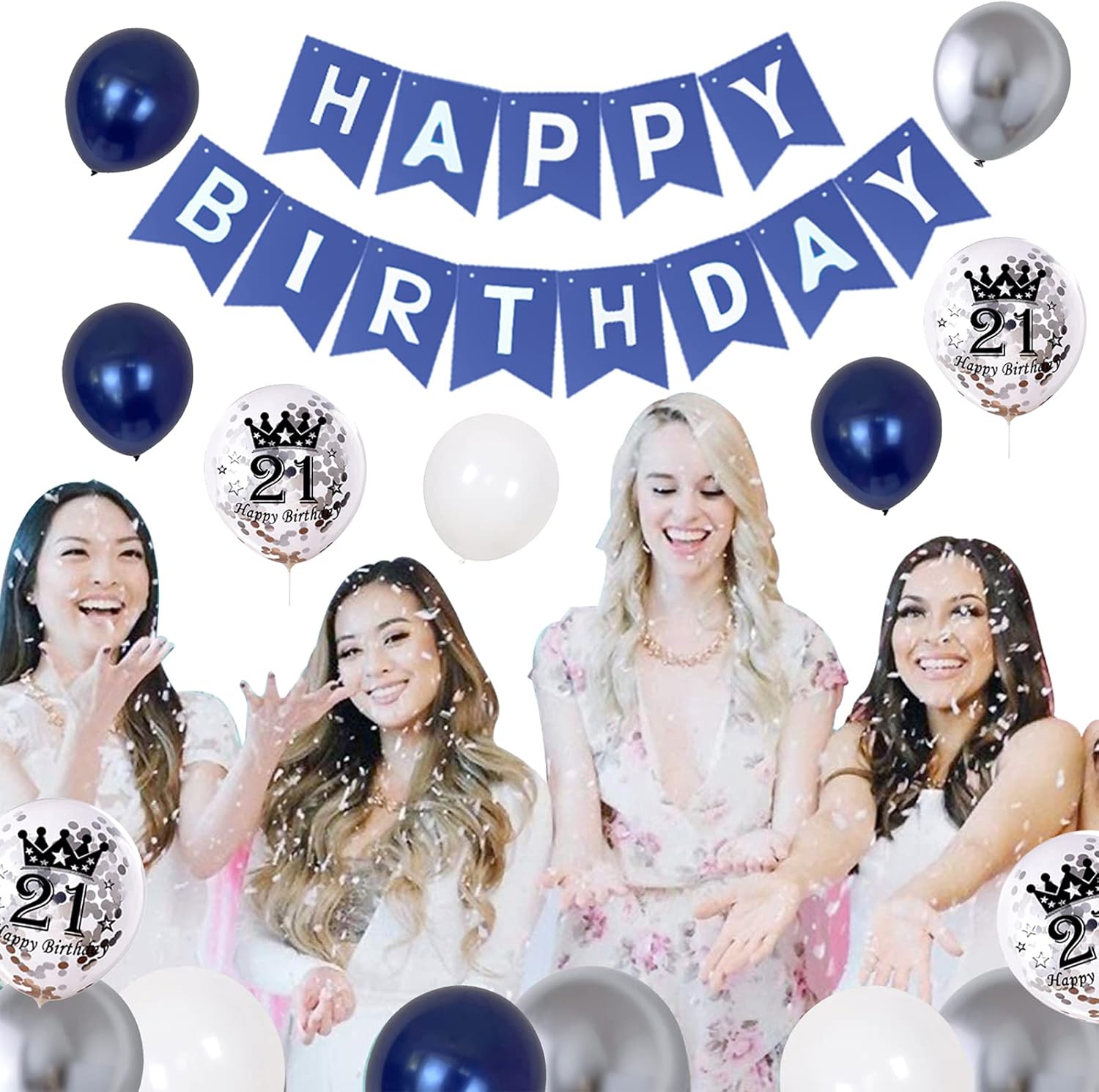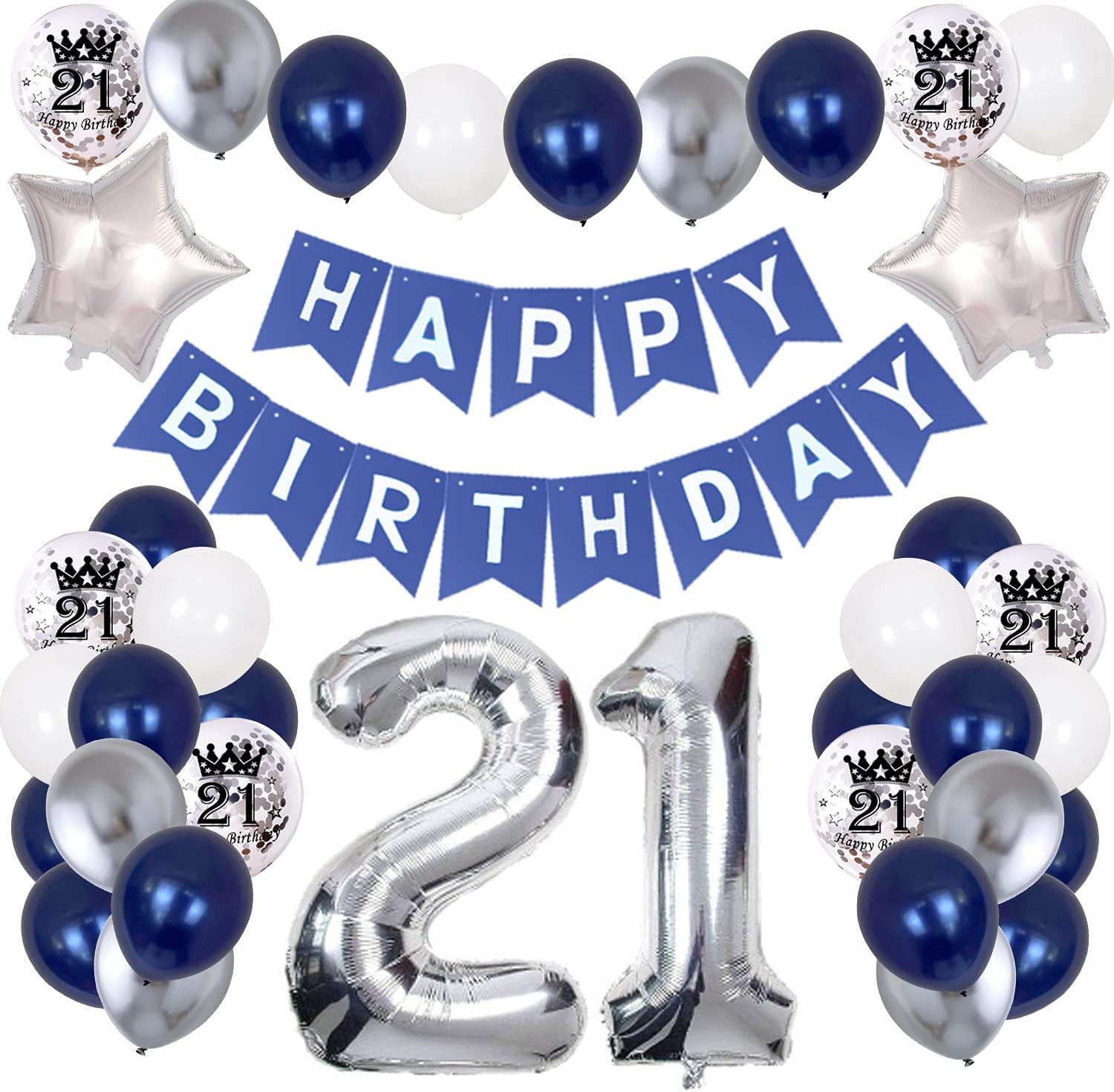 - 【21st Party Decoration Included】Dark blue "HAPPY BIRTHDAY" Banner, 32 inch Number 21, 6x12-inch metallic silver balloons, 6x12-inch matte white balloons, 15x12-inch deep sea blue balloons, 6x12-inch printed silver sequins balloons, 2x18-inch silver pentagrams balloons, 1x dot glue and straw,10M ribbon.