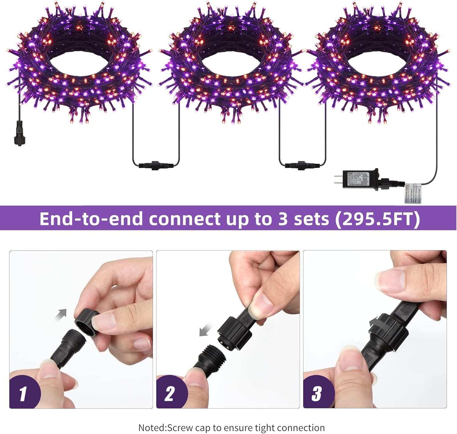 - 98.5ft Halloween Decorations string lights: With 300 Purple & Orange individual LED bulbs. Each black wire lights has end-to-end connection, you can connect up to 3 sets together to illuminate a wider range. Fit different occasions, moods, feelings, holidays, festivals, anniversaries, etc.