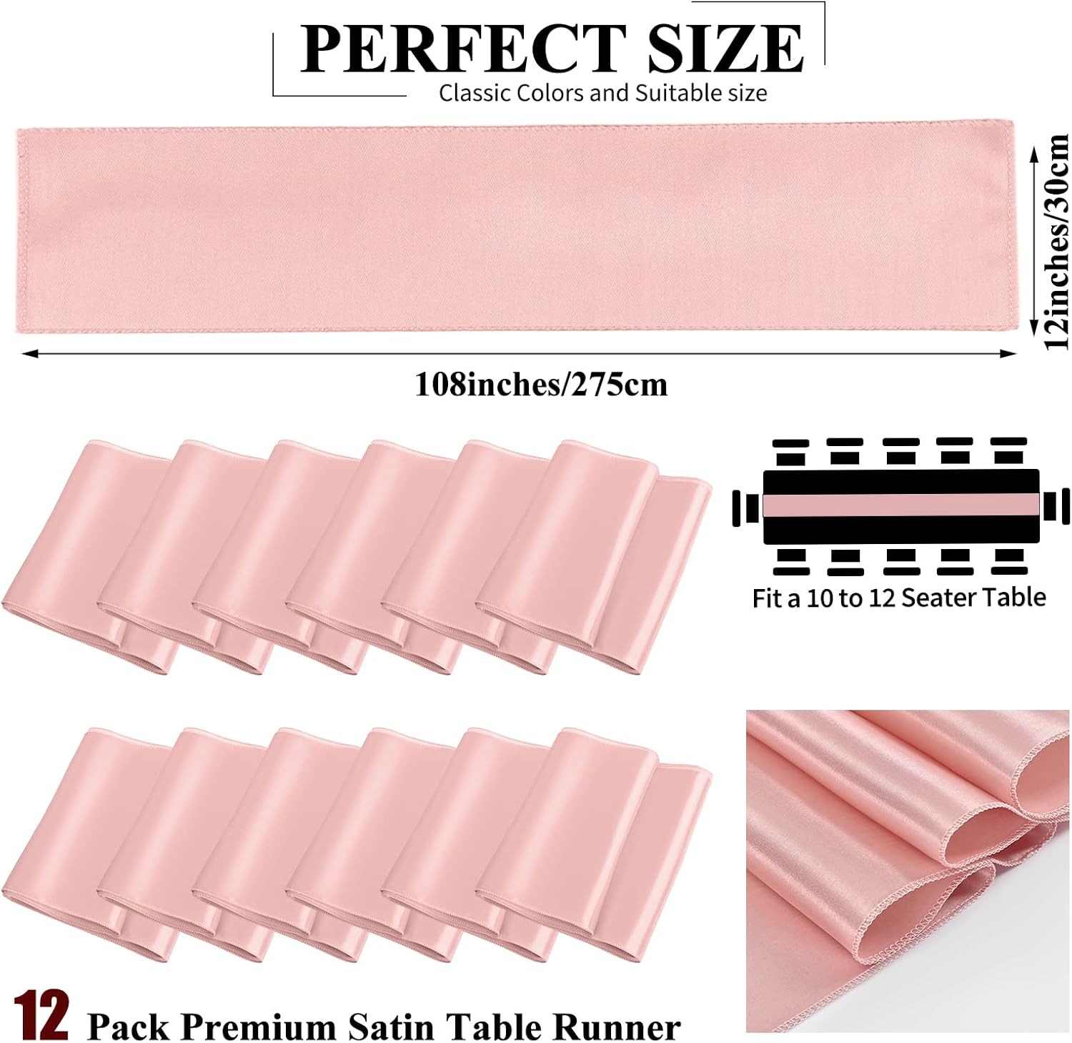 - đ°ăSet includesă12Pack rose gold satin table runner measures 12" x 108" in size, appropriate for a table that can seat 8-10 people. This satin table runner can fit a 6ft/8ft rectangular table or round table well.This satin table runner is great for event table decorations.Our satin table runner make your dining table more dazzling and outstanding.Purchase our 12piece satin table runner and save even more.